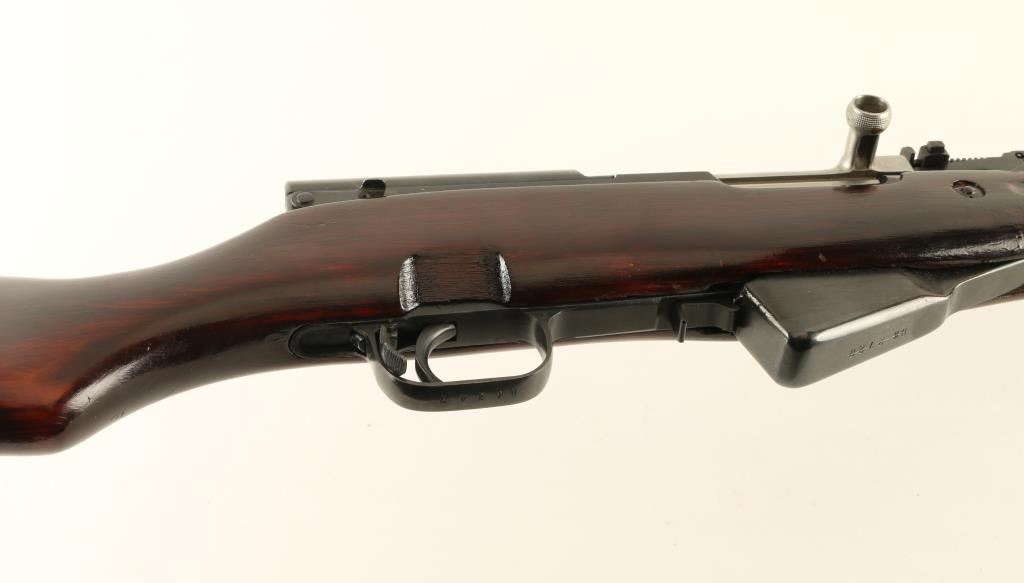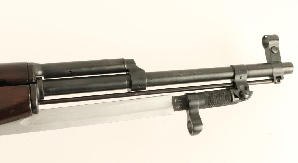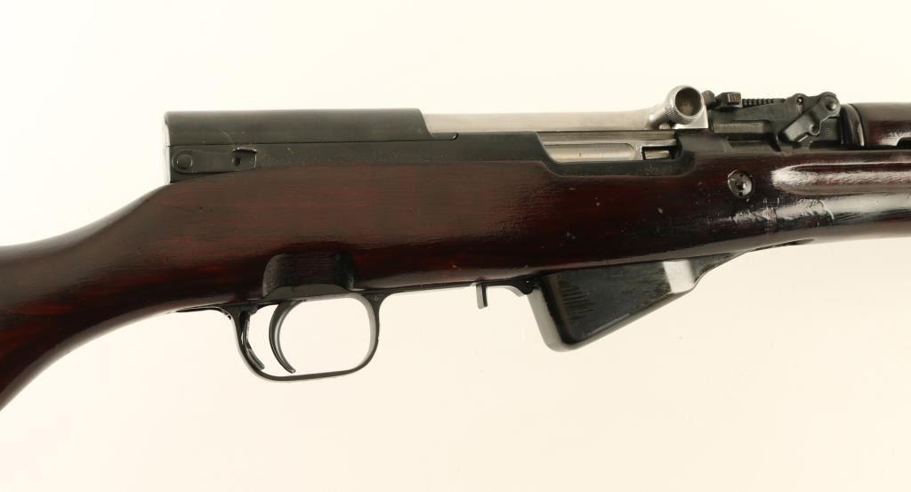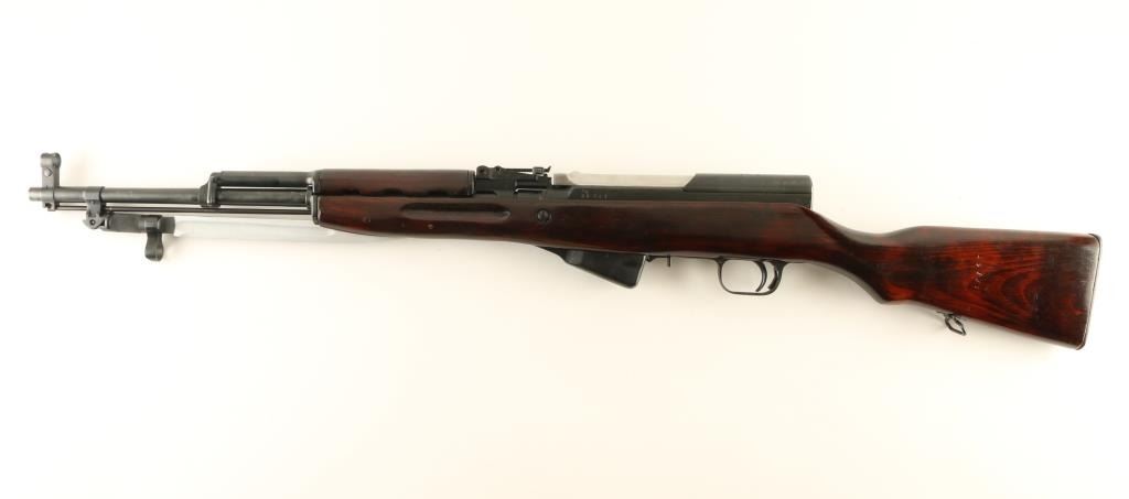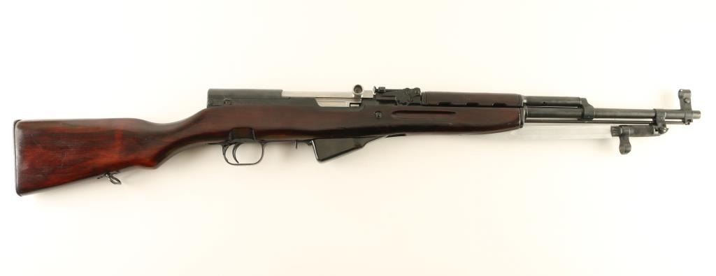 Rifle. Semi-Automatic. Russian SKS. Gas-operated. 20" barrel, with tangent rear notch (100-1000 meters), Hooded front post sight. Fixed blade bayonet. Fixed 10-rd box magazine. Thumb safety in triggerguard. All matching except the magazine. Bore appears excellent. Action is crisp. Dark varnished stock is very good with a few minor dings/sctraches. Metal finish is very good with some minor sctraches. Bolt cover dated 1954. Imported by CAL St. Albans, marked on upper right barrel. NRA Condition-Very Good. C&R Firearm.