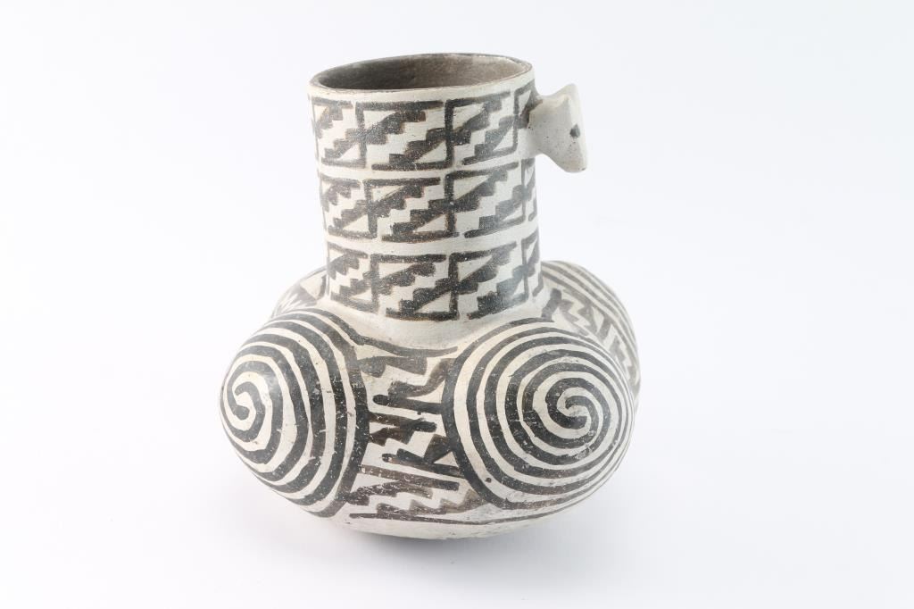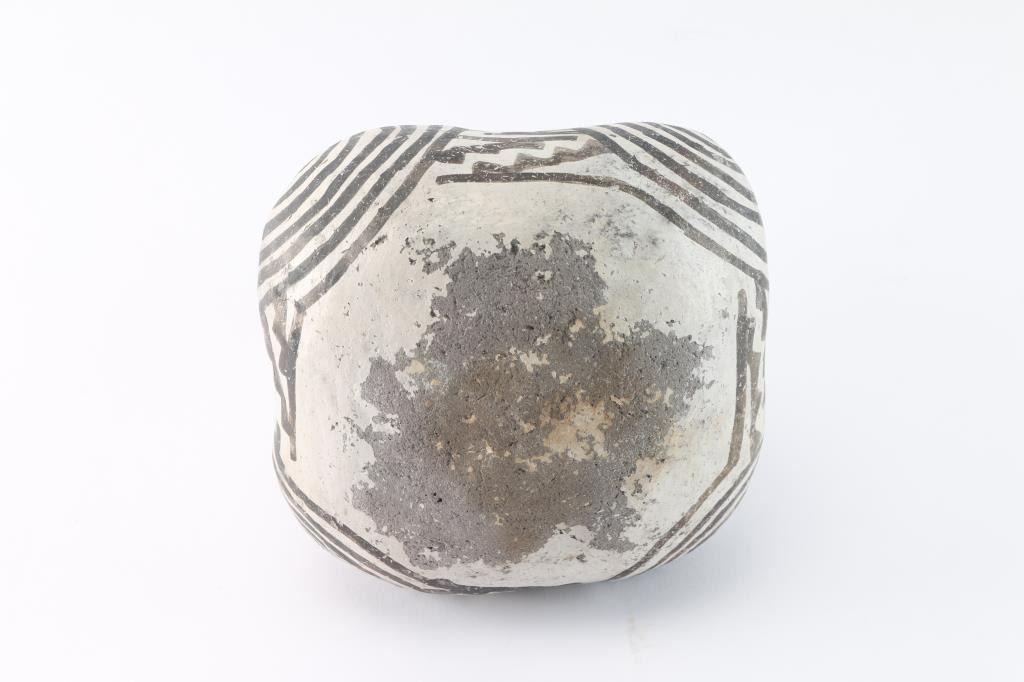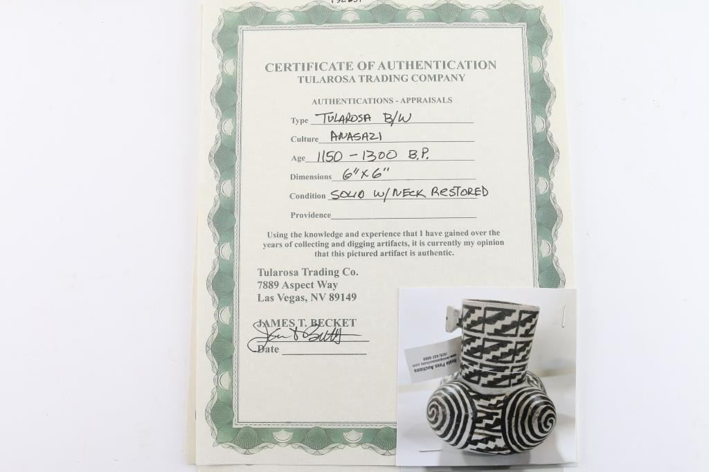 From Franklin AZ, Anasazi, 1150 - 1300 B.P. 6" x 6". Solid condition with neck restored. Includes Certificate of Authentication from Tularosa Trading Company, Las Vegas NV.