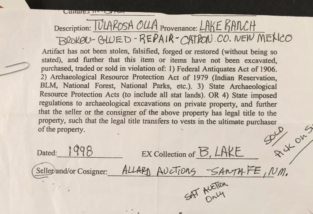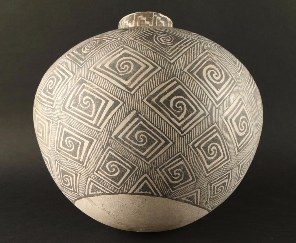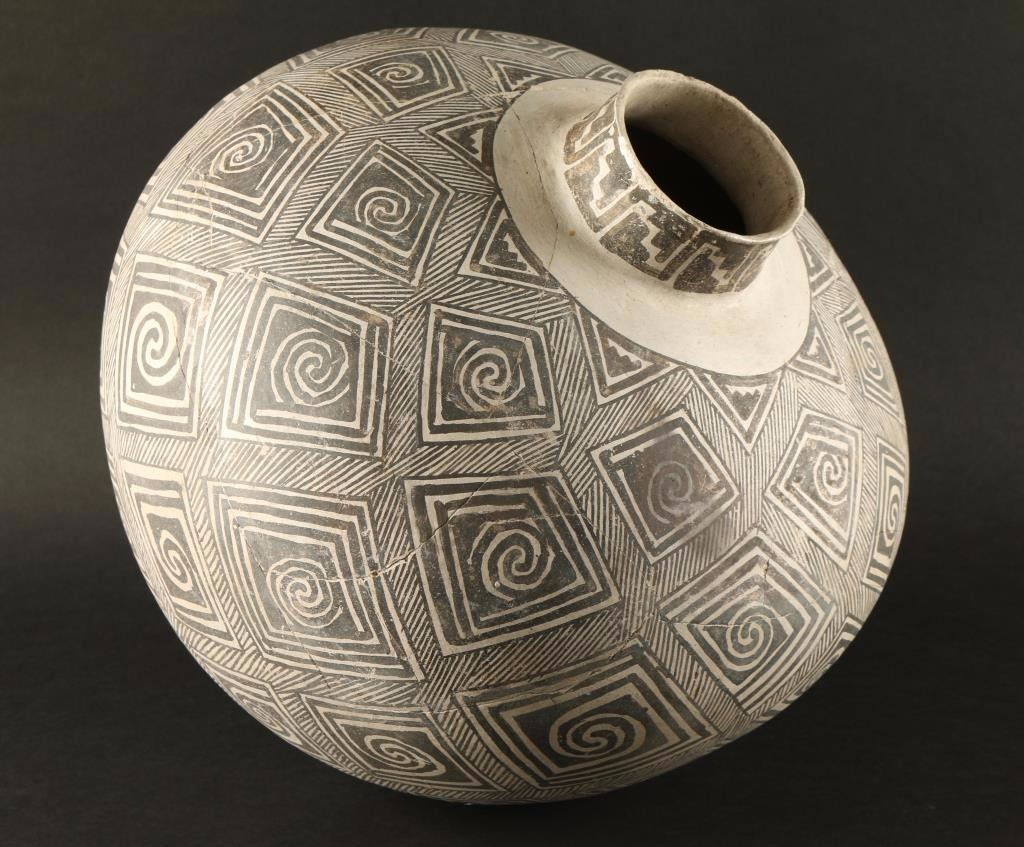 Black and white with geometric design. Found in Catron Co. New Mexico with a Provenance of Lake Ranch. Broken, glued and repaired. Measures 13"h x 11"dia. Includes Statement of Authenticity and Origin of Artifact.