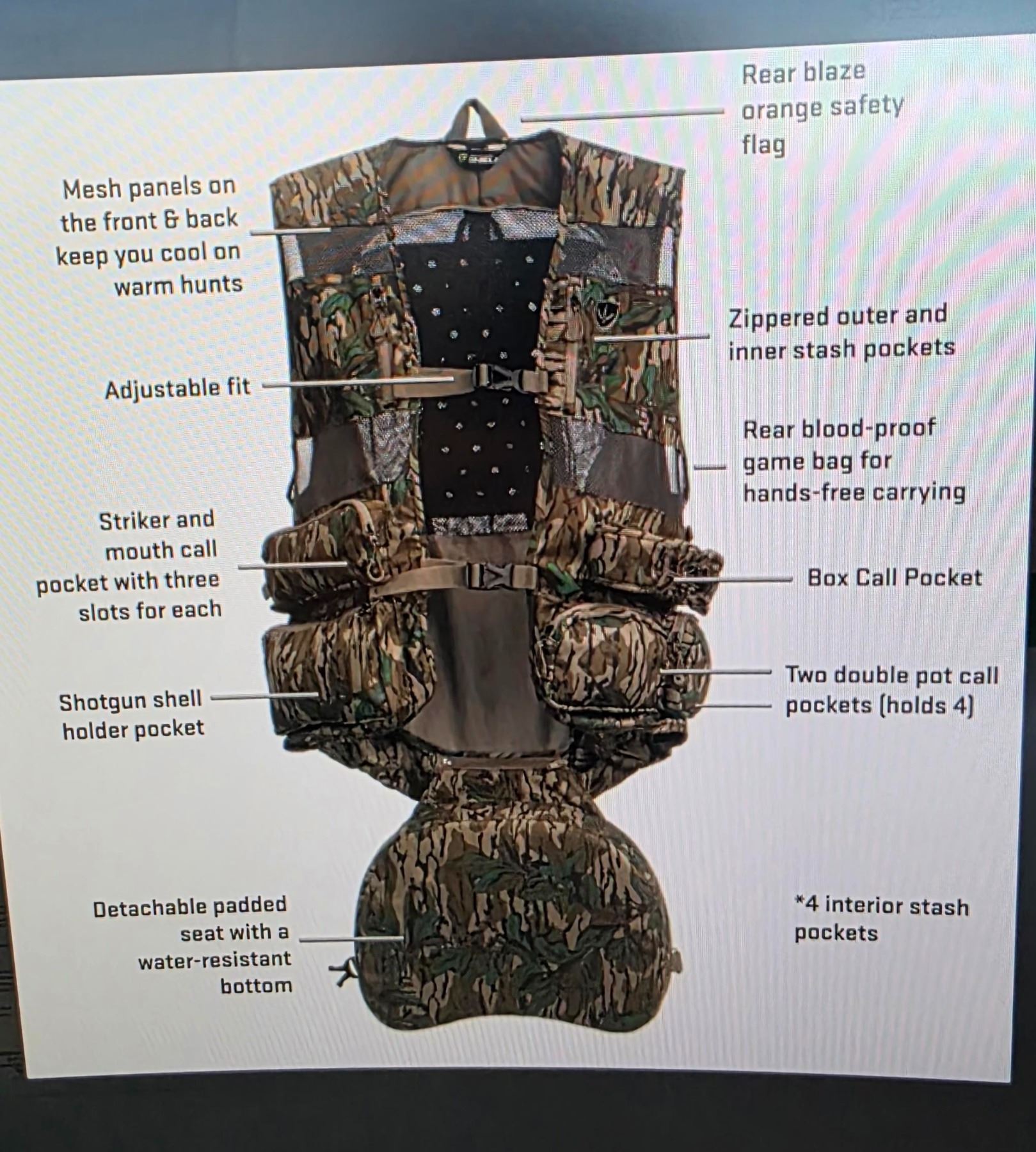 - Mesh panels on the front & back keeping you cool on warm hunts