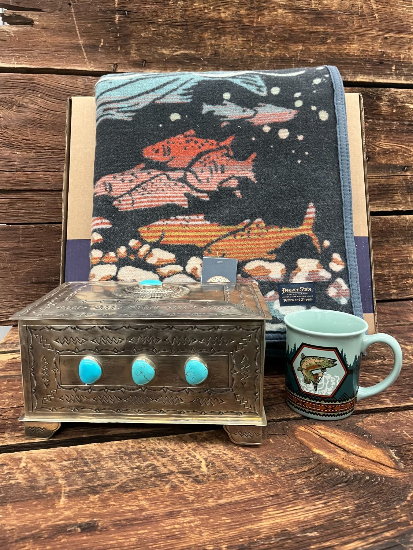 Paired with Salmon Falls Pendleton blanket and coffee mug.