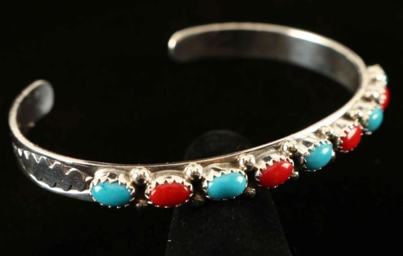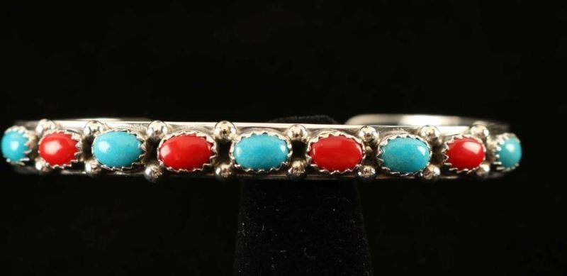 Navajo Cuff with alternating turquoise and coral stones set in sterling.