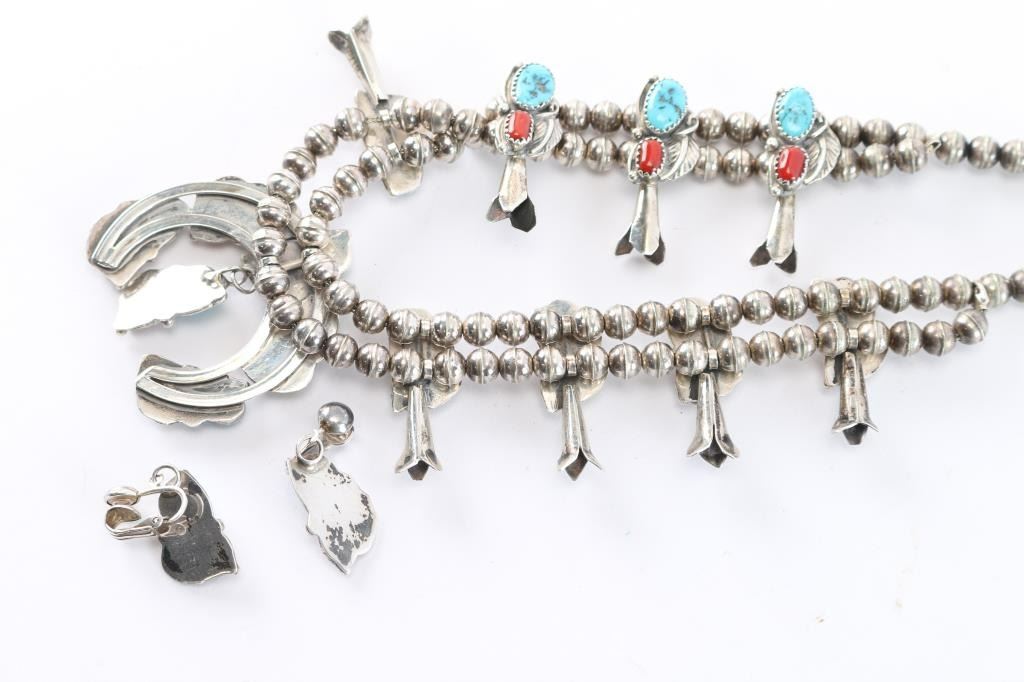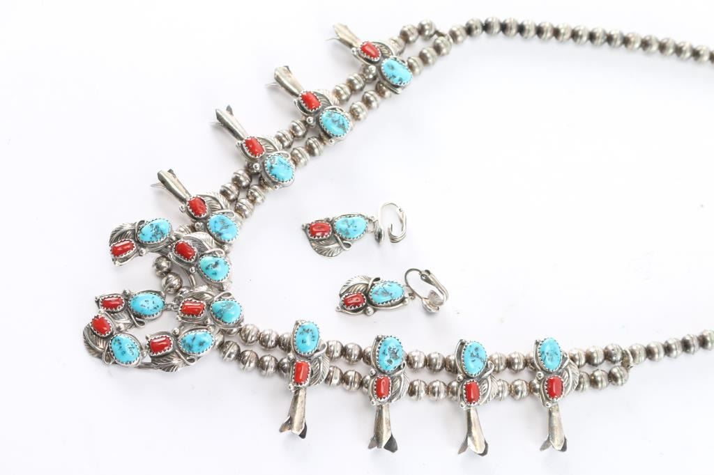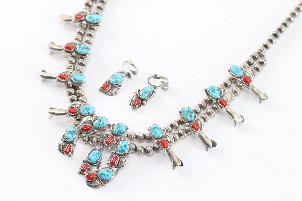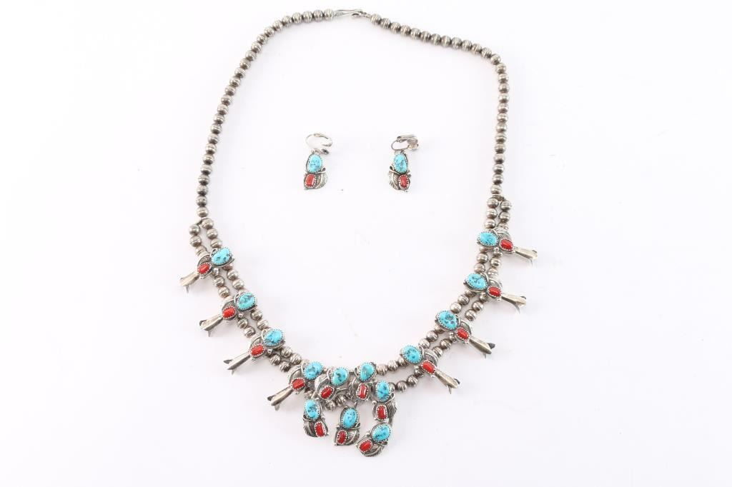 With matching turquoise and coral clip on earrings. Unmarked. Measures 12" from drop. Earrings measure 1 1/4".