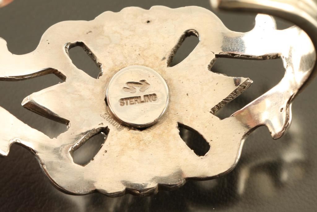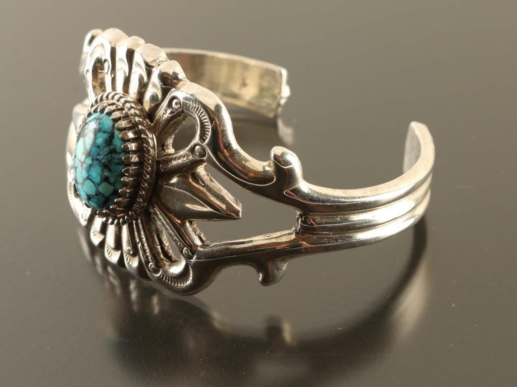 Navajo spiderweb turquoise cuff features a unique and recognizable style that was first used in the 1850s. Stamped tail feathers and a twisted wire accents the beautifully webbed stone. Handcrafted from heavy gauge sterling, it's about 1 5/8" wide at the center then tapers to the back. Stamped 'Sterling' and hallmarked. Measures 2 1/2" inside cuff.