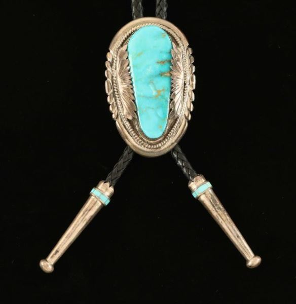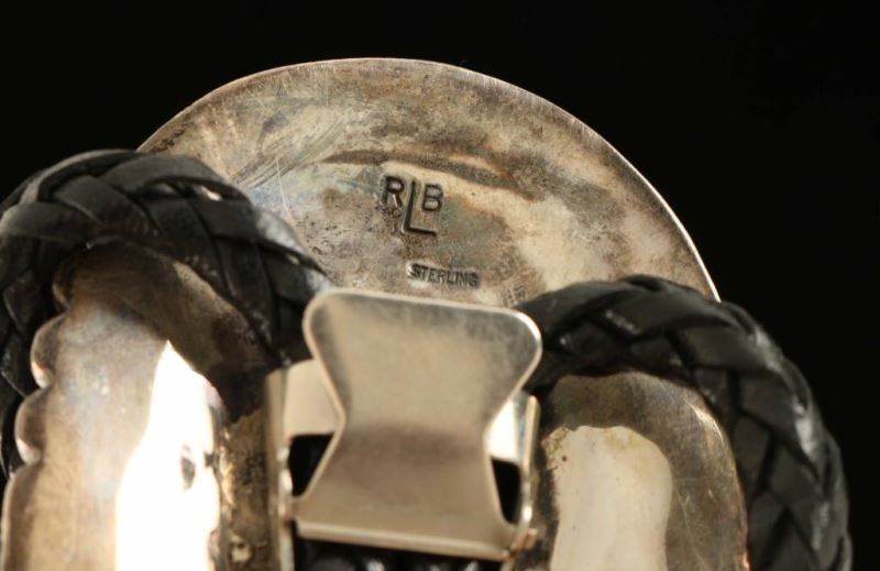 Large 3 1/4"long oval of silver with a rope design that surrounds outstretched leaves holding a substantial 2 3/4"long turquoise cab. Signed 'RLB' and 'Sterling' on a black leather basketweave cord. with silver and inlaid turquoise endpieces.