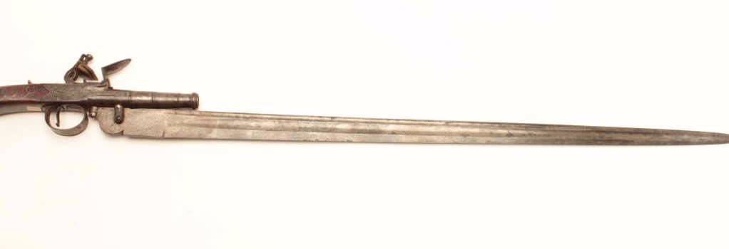 Turvy flintlock sword pistol, Queen Anne style, .45 caliber, 4” cannon barrel, 26” blade, wood grip with wire inlay and facial butt cap; in overall very good condition with crisp action, strong markings, pleasingpatina on metal surfaces with some scattered erosion; very good + grips displaying finely accomplished wire inlay. (Antique). Est.: $3,500-$7,000.