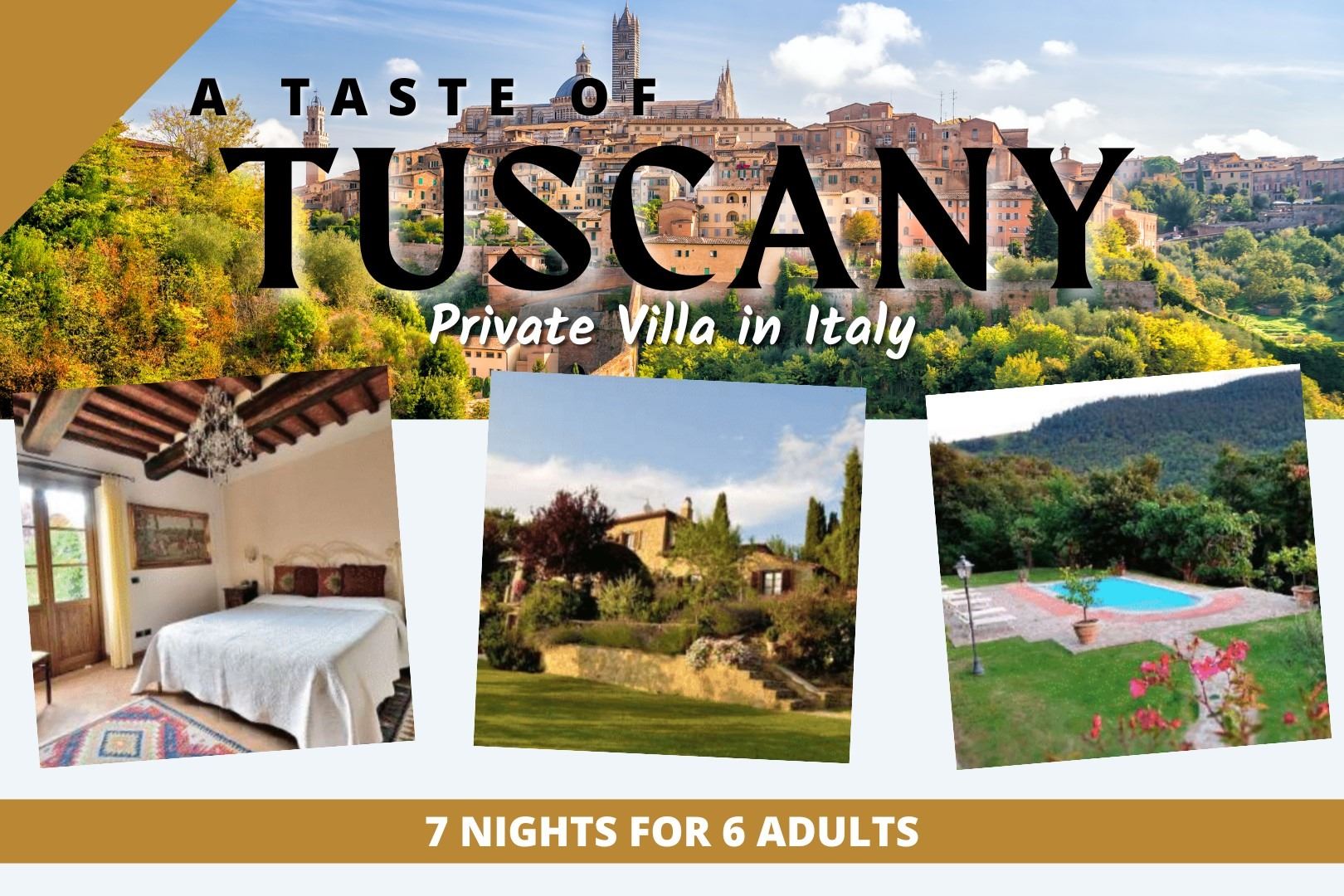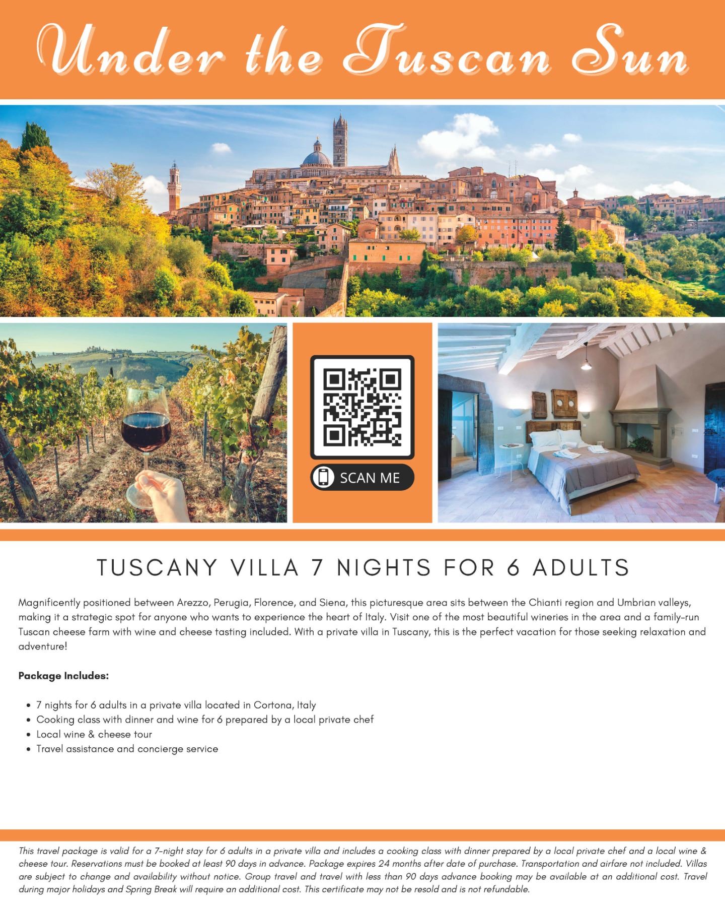 Magnificently positioned between Arezzo, Perugia, Florence, and Siena, this picturesque area sits between the Chianti region and Umbrian valleys, making it a strategic spot for anyone who wants to experience the heart of Italy. Visit one of the most beautiful wineries in the area and a family-run Tuscan cheese farm with wine and cheese tasting included. With a private villa in Tuscany, this is the perfect vacation for those seeking relaxation and adventure! Package Includes: 7 nights for 6 adults in a private villa located in Cortona, Italy. Cooking class with dinner and wine for 6 prepared by a local private chef. Local wine & cheese tour. Travel assistance and concierge service. Terms & Conditions: This travel package is valid for a 7-night stay for 6 adults in a private villa and includes a cooking class with dinner prepared by a local private chef and a local wine & cheese tour. Reservations must be booked at least 90 days in advance. Package expires 24 months after date of purchase. Transportation and airfare not included. Villas are subject to change and availability without notice. Group travel and travel with less than 90 days advance booking may be available at an additional cost. Travel during major holidays and Spring Break will require an additional cost. This certificate may not be resold and is not refundable.