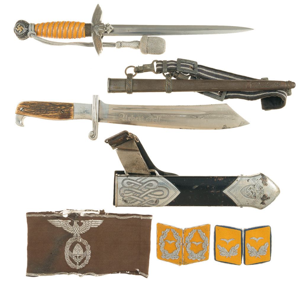 1) Eickhorn Luftwaffe dagger, 15" OAL, 9 3/4" blade, orange grip, silver wire portepee and a sheath with ribbon hanger. Mild spotting, otherwise good. 2) Krebs RAD enlisted hewer, 14 3/4" OAL, 9 5/8" blade, stag grip, black enamel sheath with leather hanger. Fair, with flaking nickel. 3) Two pair of Luftwaffe rank tabs (1 General major, 1 Lieutenant w/blue trim) and a RAD armband (brown cloth with silver wire borders and silver thread emblem). Tabs good with light stains, and the armband is rough, with wear and material loss.