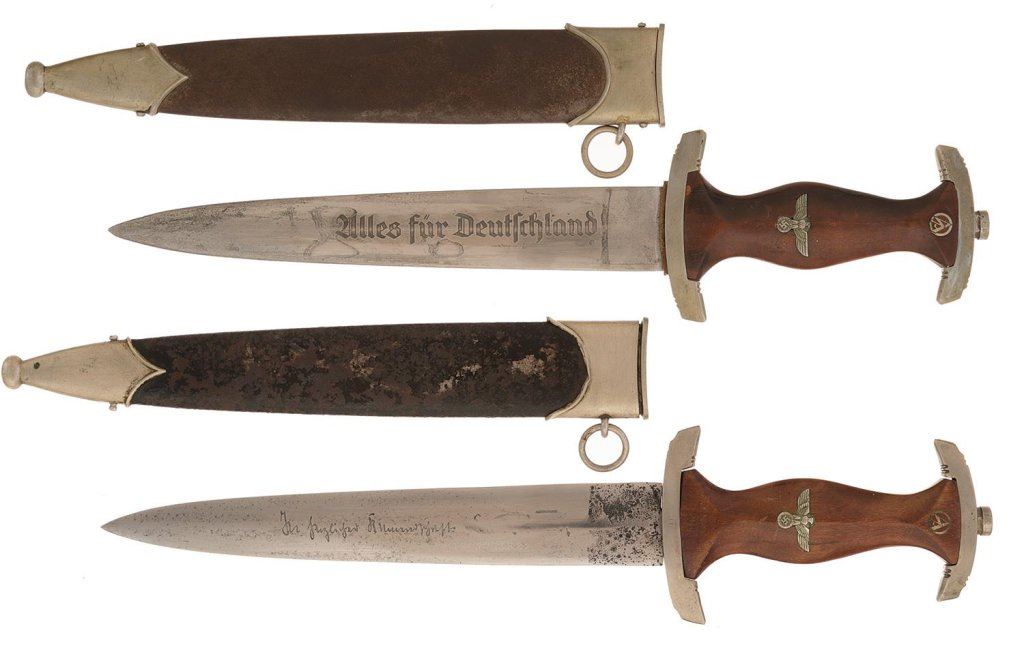 Both daggers have blades etched "Alles fur Deutschland" on the obverse, were formerly etched with the Rohm honor inscription on the reverse, and have wood grips, nickel fittings, and enamel finished sheaths. 1) NSKK dagger, 13 1/2" OAL,, 8 5/8" blade, defaced signature, "Fr" guard and black finished sheath. Sheath and blade rough. Fittings fair. 2) SA dagger, 13 1/2" OAL, 8 1/2" blade, full inscription defaced, "Ho" guard and standard hilt and sheath. Fair.