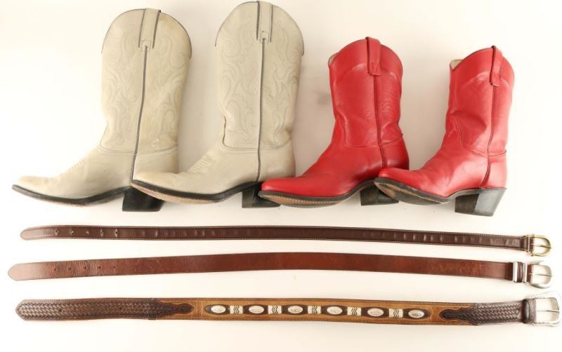 Texas brand red leather boots size 7 1/2M and a pair of gray Westex brand boots size 4 1/2M. Well taken care of, in their original boxes. Includes 3 ladies used leather belts.