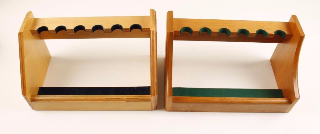 Very well made wood pistol racks with felt lining and slots for six pistol each. An excellent way to store handguns efficiently. Condition of both is very good.