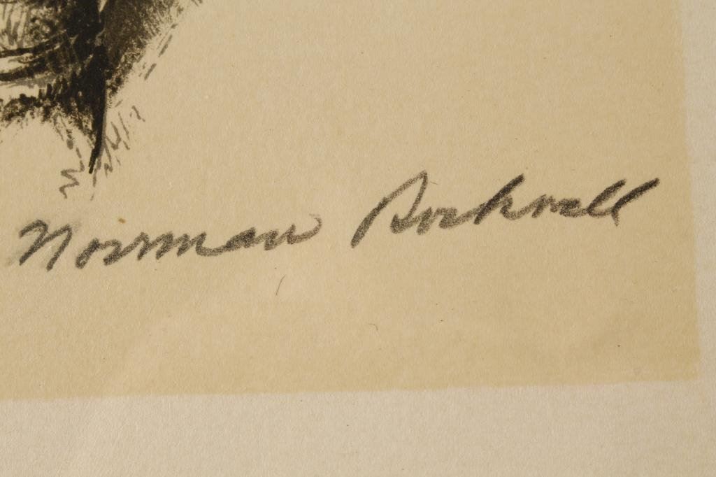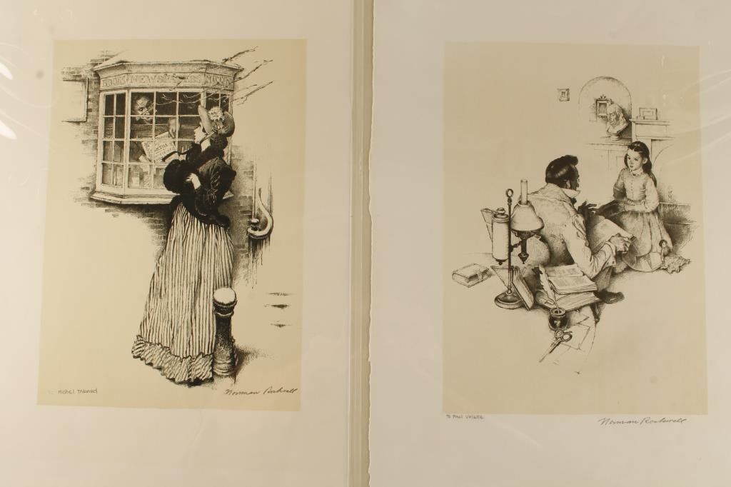 Two black and white hand signed Norman Rockwell prints; one inscribed to Paul Valette by the artist; the other to Michel Tabarci; approximately 16” x 11” on irregular edge thick rag type paper. Probably earlier as later prints tended to be colorful. Est.: $300-$600.