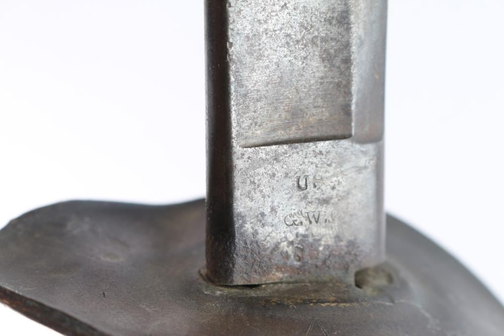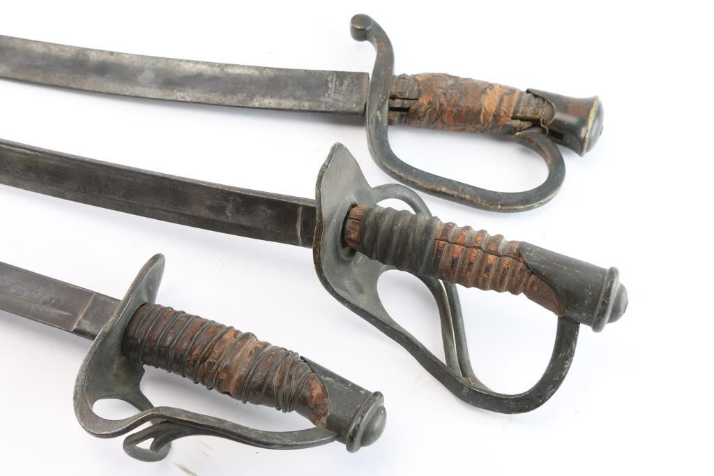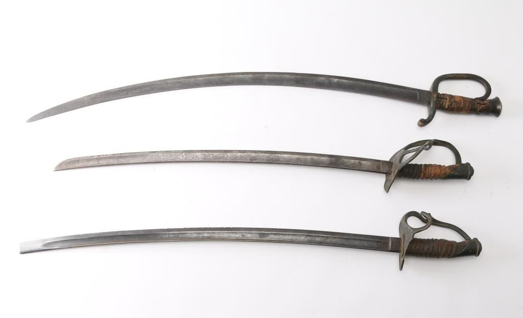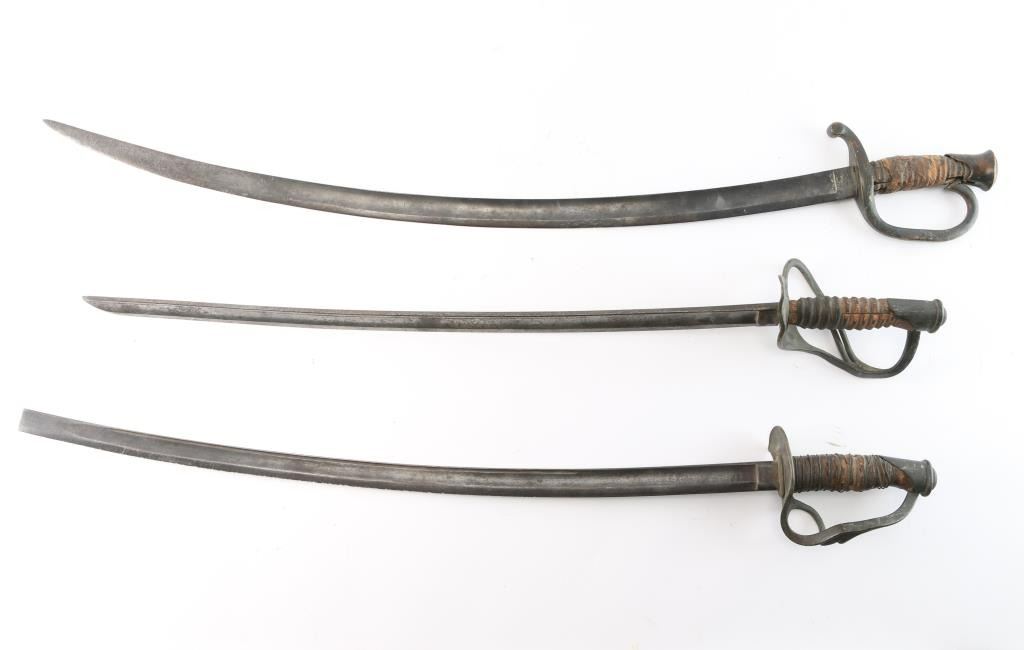 Lot of three 'Battlefield Pick-up' U.S. Civil War Swords. Recovered from battlefields some time after the war, have been in the elements for some time. Relic condition. All three are enlisted swords. 1) 1860 Light Cavalry saber. Ricasso marked "Prov. Tool Co." Made by the Providence Tool Company, Rhode Island, one of 10,434 sabers they produced under the Ordnance Department contract of February 1862. Reverse marked "US RPB 1863". Leather gone on handle, wire in place, the tip of the 35" blade broken off, measures 28 1/4" , leather washer still in place, edge has many nicks, two branch guard is broken. 2) Same as above, ricasso marked "Made by “AMES Mfg/CHICOPEE/MASS.” Reverse marked " US CWC, can't read the date, guard is dented, bent, wood handle has a large chip out of it, no leather or wire, blade shortened to 25 1/2", nicks to the edge. 3) M1840 artillery saber, complete, 31 1/2" blade, leather gone, small piece of wire remaining, has very old wrap around the wood, brass guard loose from the pommel, can't read the markings, ricasso and lower portion of the blade heavily pitted. Would make a great display, especially if you have battlefield pick-up Firearms.