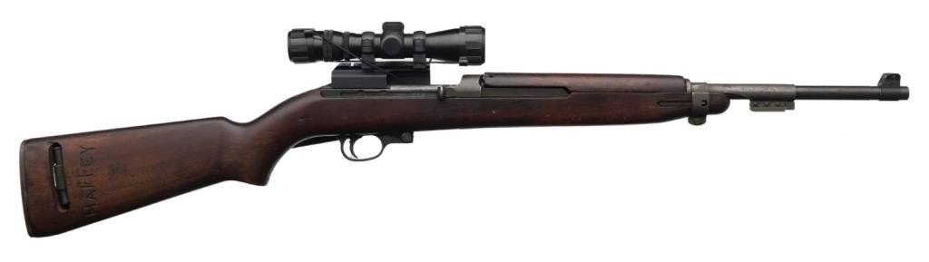 **U.S. M-1 semi-automatic carbine, .30 caliber, 18” barrel, S/N 5090611, no magazine, military finish, wood stock, green sling and mounted with a modern 4 X 28 scope with crisp optics; overall very good condition; stock’s right side is stamped “HAFFEY”. Est.: $500-$800.