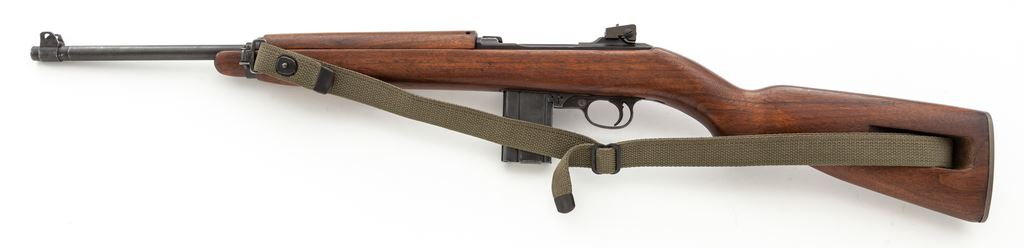 U.S. M1 Carbine, by Inland, #616048, .30 Carb. cal., 18'' Inland barrel dated 8-43, oval-cut low wood stock marked ''WRA/GHD'' with small Ordnance wheel, two-rivet forend, round bolt, milled adjustable rear sight, push-button safety marked ''EW'', with one ''IA'' marked 15-round magazine and post-war green canvas sling. Condition is excellent retaining approx. 90% parkerized finish with most of the losses to the bolt. Winchester mfg'd stock with very small handling marks. Good action, bright bore. Est.: $600-$800. (C&R)(High cap mags not available to Calif. residents.)