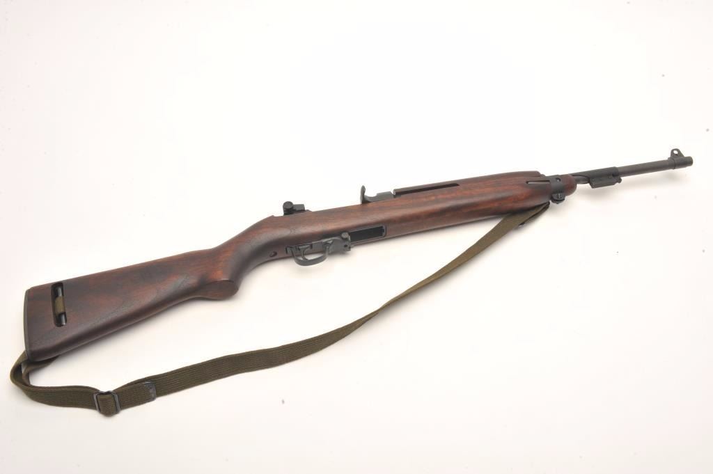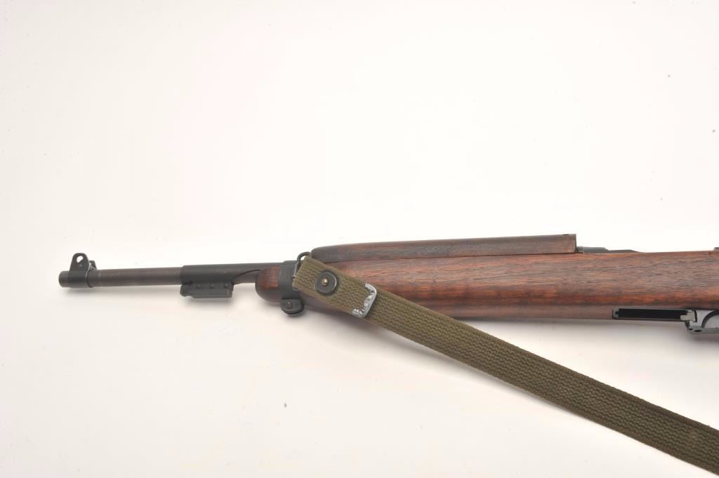 U.S. M1 semi-automatic carbine by Rock-Ola, .30 caliber, 18” Rock-Ola barrel dated 12-42, military finish, wood stock, with crossed cannons and “RM” inspections on right side of butt stock, no magazine, woven green slingand metal oiler; bayonet lug, flat bolt, S/N 6087003, in overall fine condition, all Rock-Ola as rebuilt. (C&R/PPT). Est.: $800-$1,600.