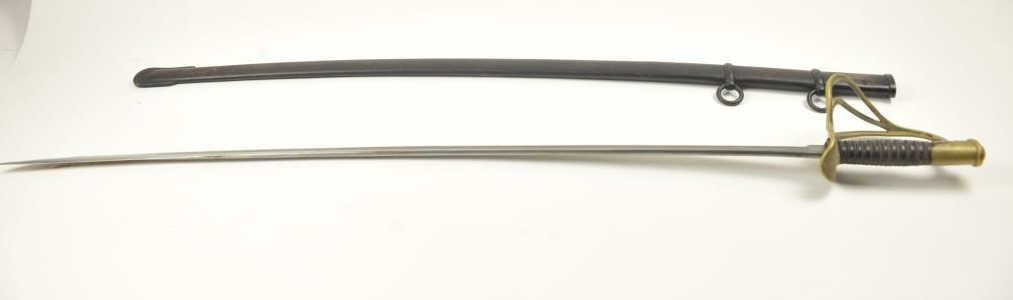 U.S. Model 1860 Cavalry Sword with scabbard “Emerson and Silver, Trenton, N.J., A.D.K”. inspection and 1865 date. The blade has been cleaned nicely but lettering is light, scabbard is very good with black enamelpaint, the grips is also very good with minor cracking and aging. Civil War era to early Indian Wars. Note: A 89 stamped on the guard and 4 marks on the pommel. Est.: $175-$350