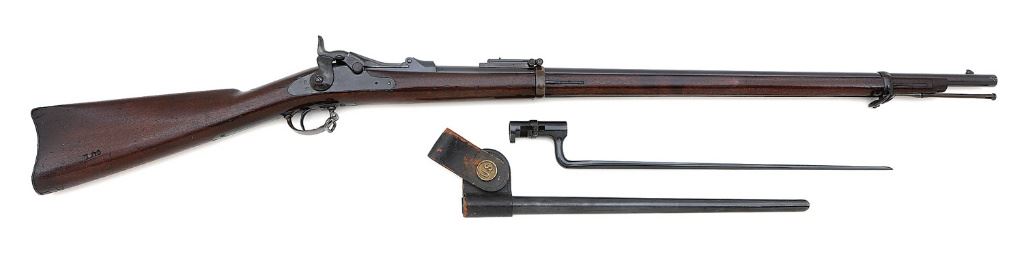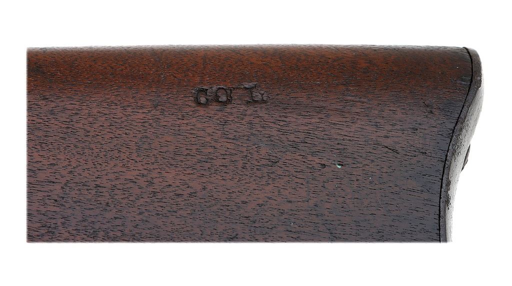 serial #143123, 45-70 Govt., 32 5/8'' barrel with a near excellent bore showing some sparse fine pits and oxidation with crisp rifling throughout. The metal surfaces retain about 90% original blue toning to brown with light socket wear at the muzzle and some sporadic light oxidation primarily at the breech and on the hammer. The 1873 dated breechblock and rear tang have muted to a brown and gray case-hardened patina with some fine oxidation and faint traces of bright colors in the protected areas, the markings remain clear except for the beginning of the serial number. The walnut stock remains in very good plus condition with overall light dents and handling marks one would expect of a carried arm and a thin crack in the top left side of the wrist behind the frame. The 1883 dated cartouche and firing proof remain strong and there is a small inverted ''COL'' stamped in the right side of the buttstock. The rifle is equipped with a proper front sight, later Buffington rear sight, bronze firing pin, slotted button tip cleaning rod and a socket bayonet and scabbard with belt loop and brass ''US'' escutcheon in equally nice condition. A very nice 1879 Trapdoor rifle and bayonet. (5B11666-11) {ANTIQUE} [Casey Collection] (1000/1500)