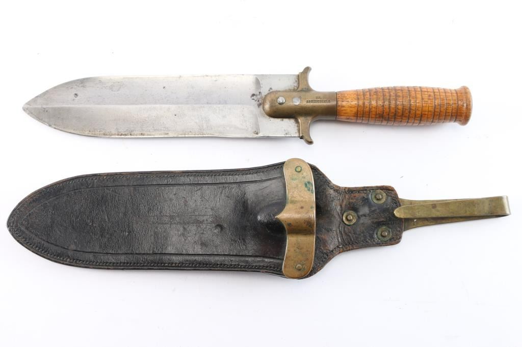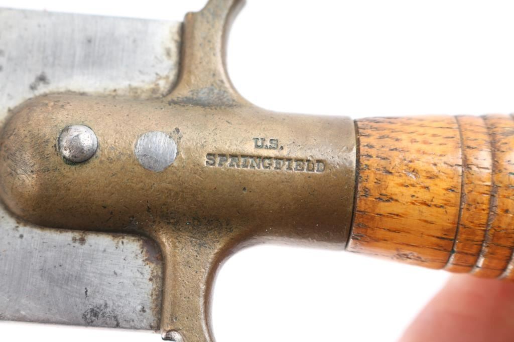 Springfield Arsenal marked. Good scabbard partial visible marks. Small chip to wood butt and blade. Original bright with full dimensions. From John Kopec Cavalry collection.