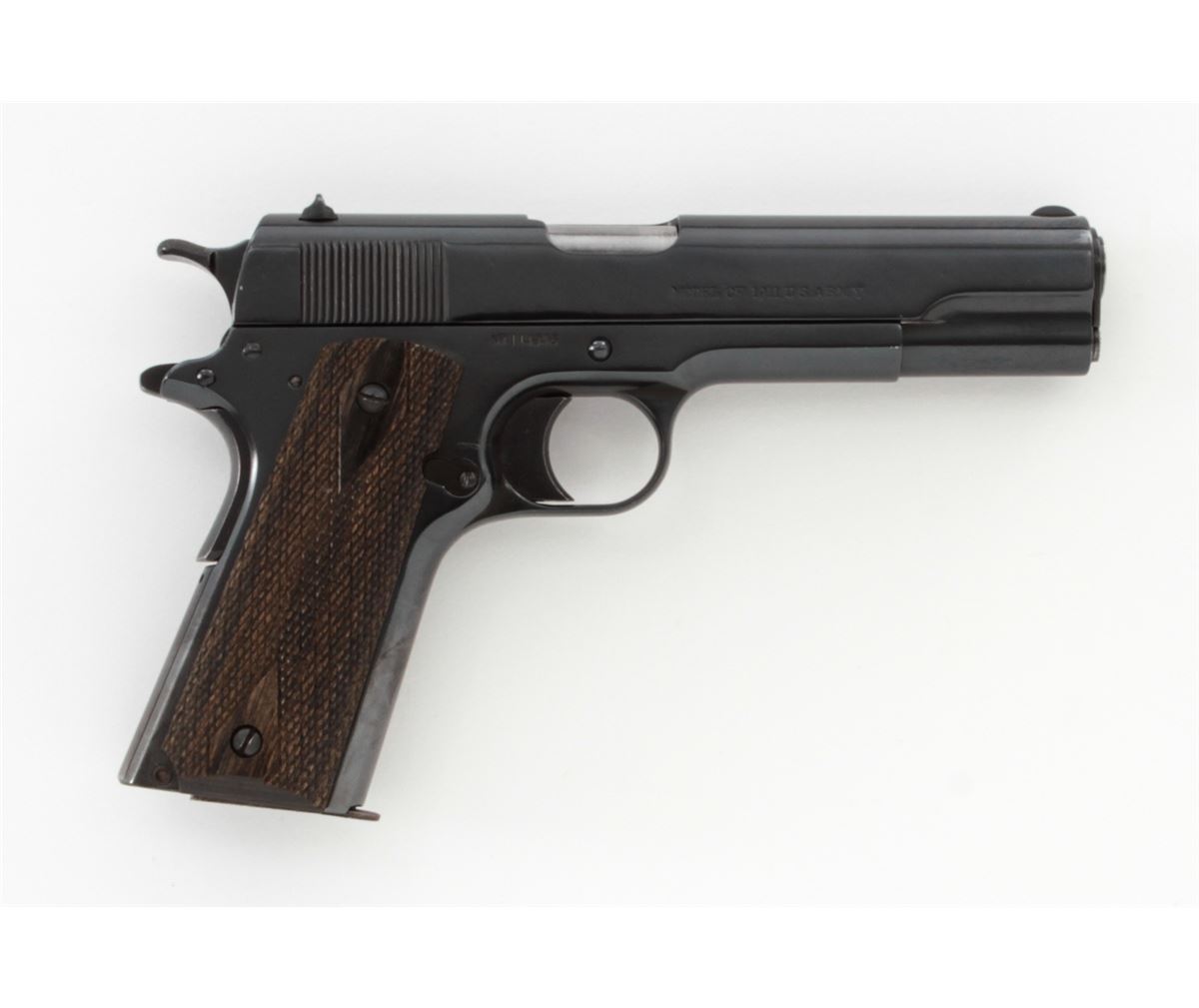 U.S. Model 1911 Semi-Automatic Pistol, by Springfield, #114946, .45 ACP cal., 5'' barrel, blue finish, aftermarket diamond checkered grips, with post-WWII era magazine. Condition is very good as immersion blue refinish, retaining approx. 98% later blue, with 1916 era Colt slide and mixed parts. Modern grips are fine. Action is crisp, bore is bright. Est.: $500-$750. (C&R)