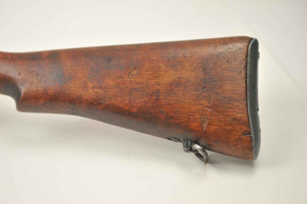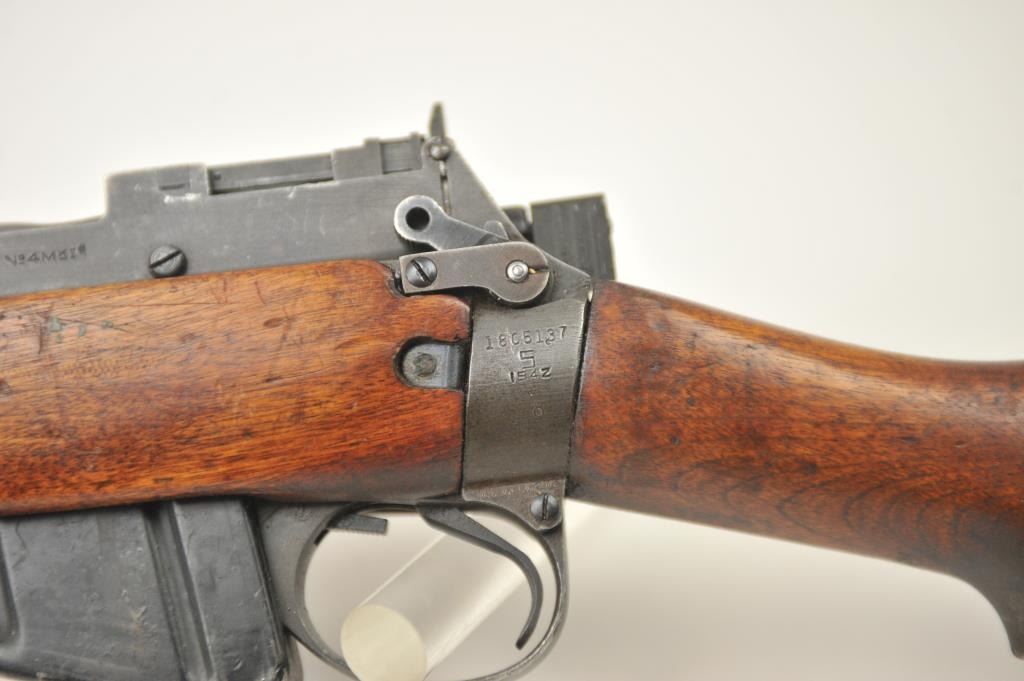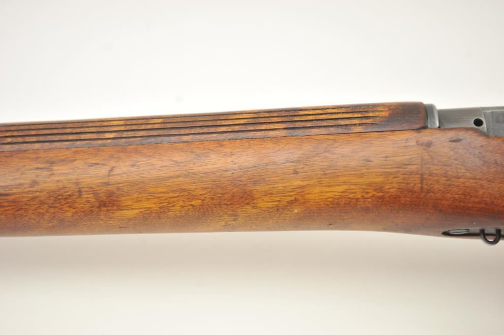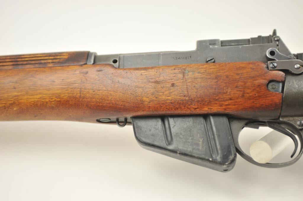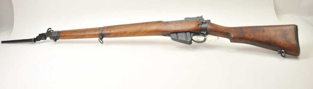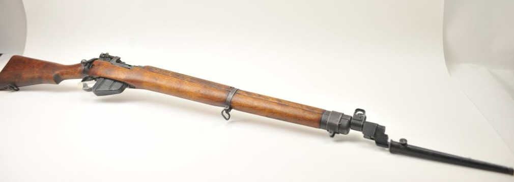 U.S. Property marked Lee-Enfield No.4 MK. I bolt action rifle, .303 British caliber, Serial #1805137. The rifle is in very good overall condition with a 25” barrel with a protected blade front and military aperturerear sight and spike bayonet with scabbard. The rifle retains a significant amount of the military finish, marked, “U.S. PROPERTY” on the left rail. The wrist strap is dated 1942 and marked, “S” for Savage. The smoothwood stock is in good condition with a faint cartouche behind the trigger guard. The rifle has sling swivels and a brass butt plate. The bore is fair, the action functions well and the markings are legibleon this WWII era No.4 MK I. Est.: $250-$500. (C+R).