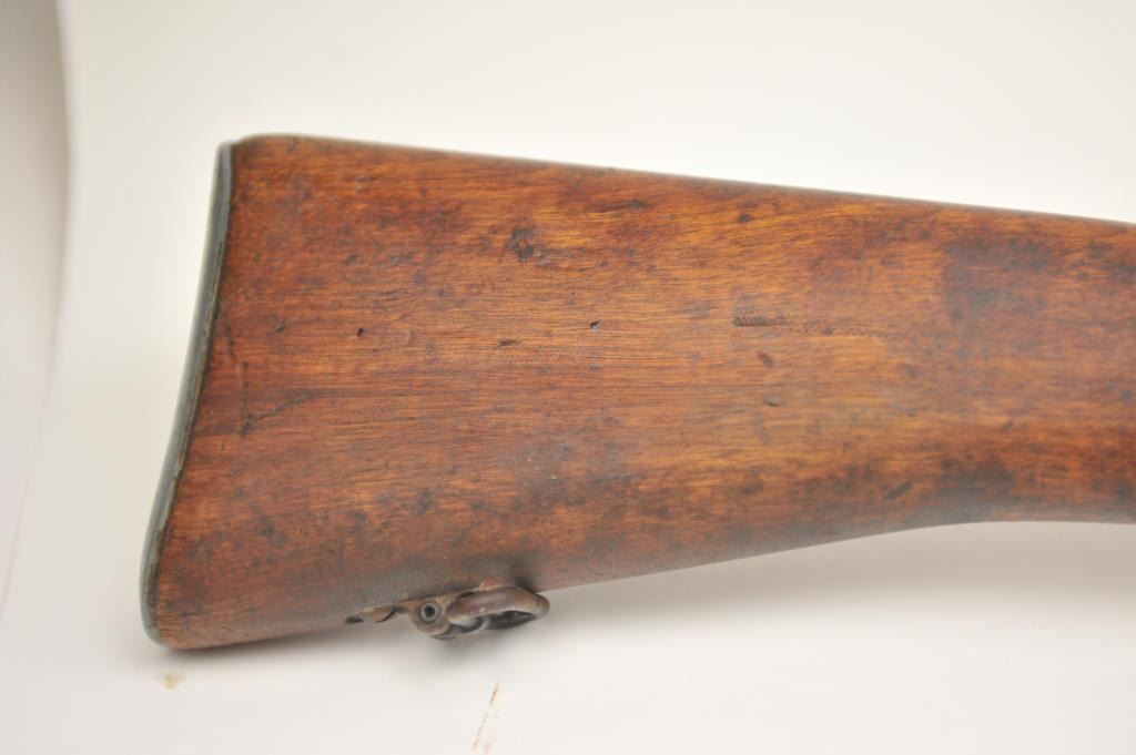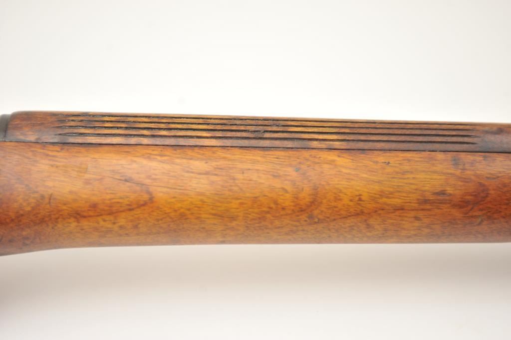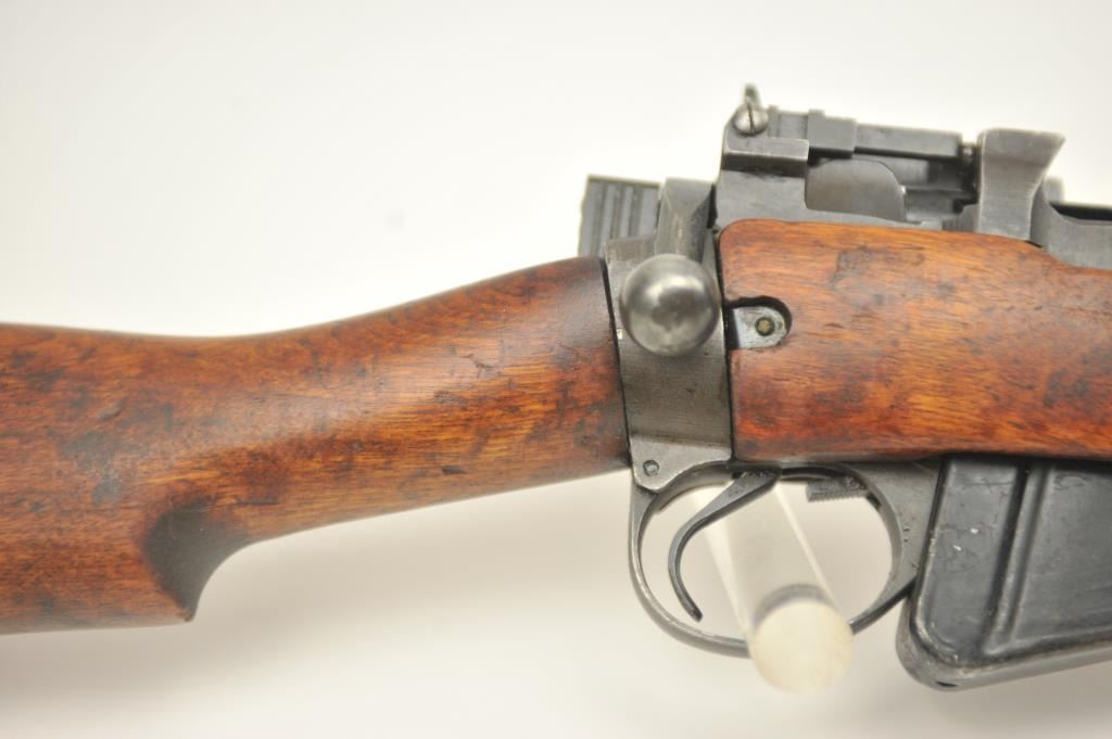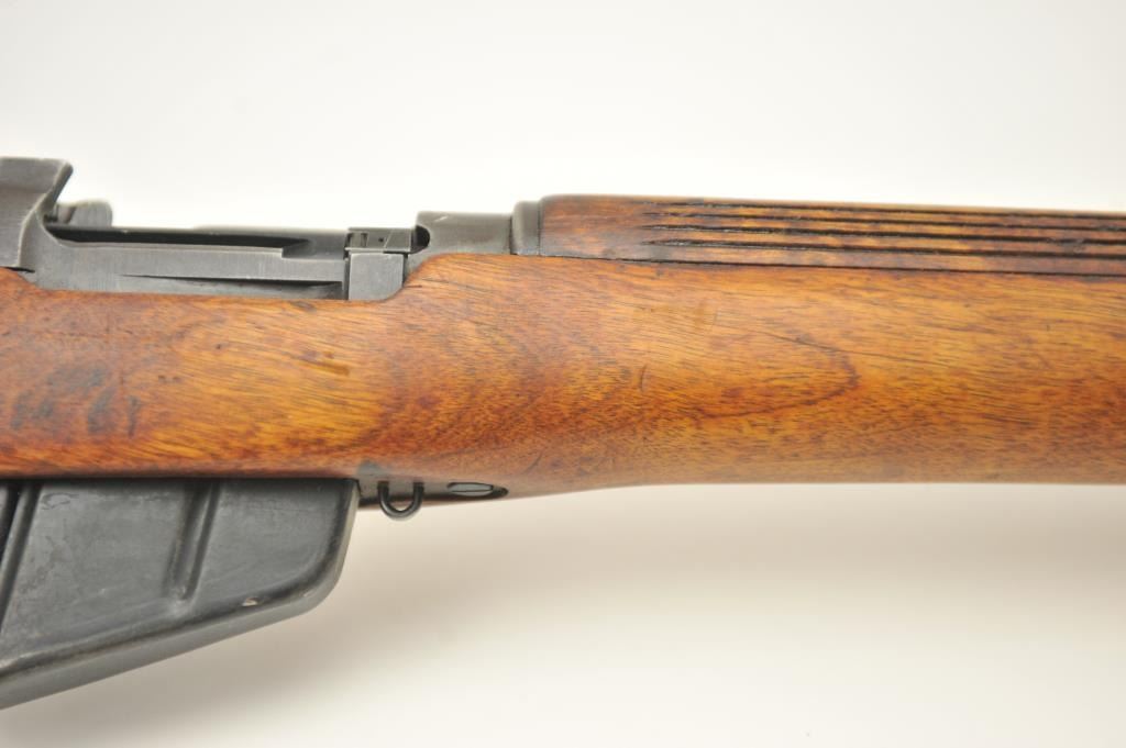 U.S. Property marked Lee-Enfield No.4 MK. I bolt action rifle, .303 British caliber, Serial #1805137. The rifle is in very good overall condition with a 25” barrel with a protected blade front and military aperturerear sight and spike bayonet with scabbard. The rifle retains a significant amount of the military finish, marked, “U.S. PROPERTY” on the left rail. The wrist strap is dated 1942 and marked, “S” for Savage. The smoothwood stock is in good condition with a faint cartouche behind the trigger guard. The rifle has sling swivels and a brass butt plate. The bore is fair, the action functions well and the markings are legibleon this WWII era No.4 MK I. Est.: $250-$500. (C+R).