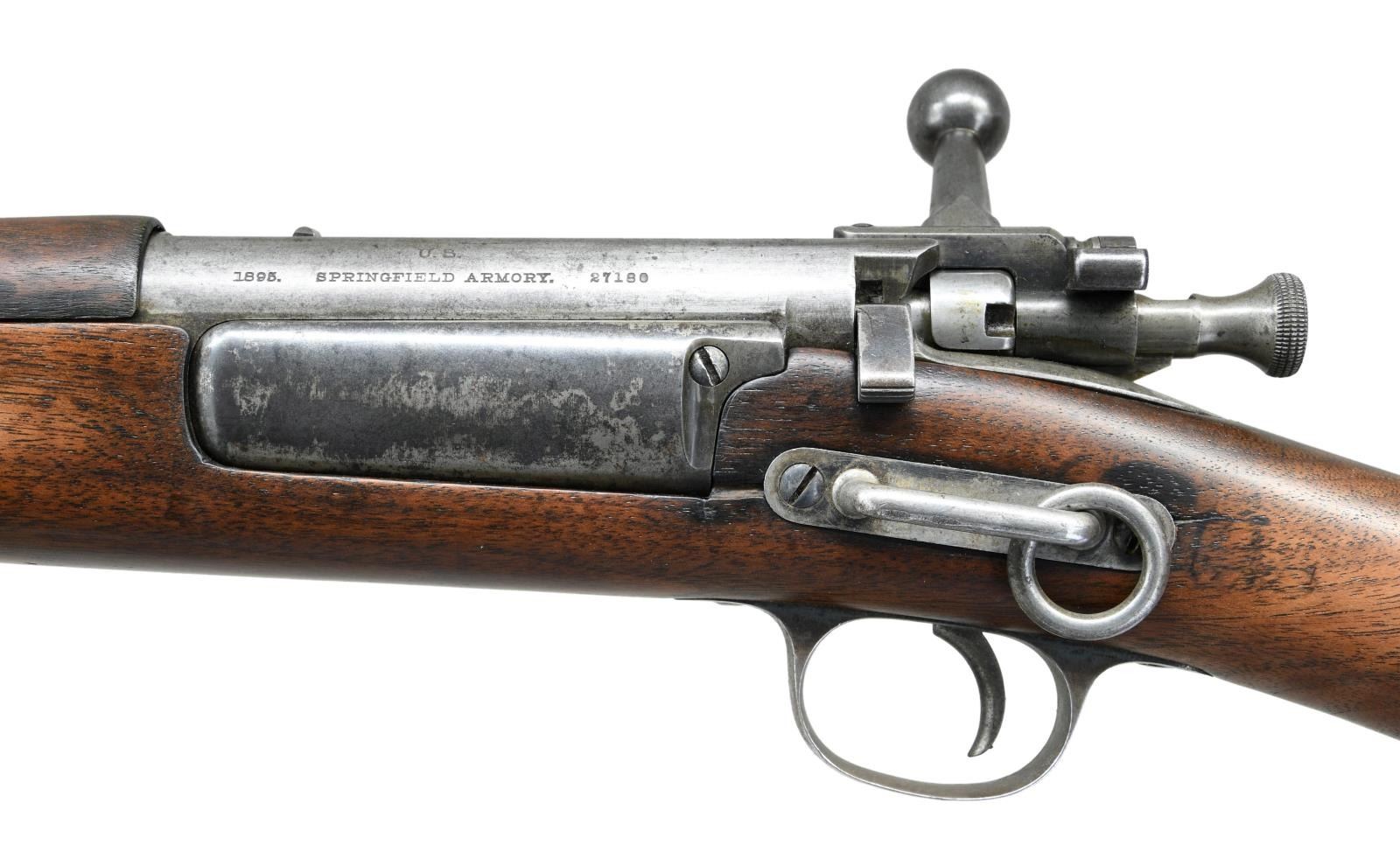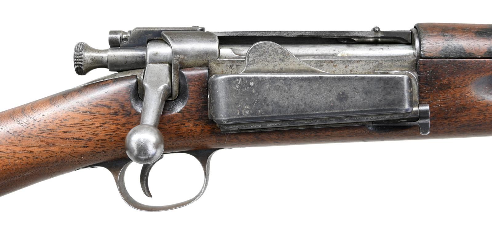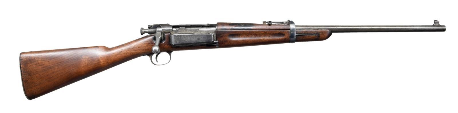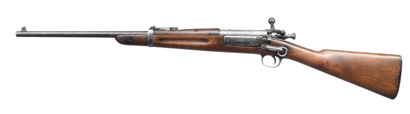 (MODEL 1895) CARBINE. Cal. 30-40 Krag. S# 27180. The 22" bbl. attaches to stock with single band which protects front portion of sight. Action with 1895 date without model is in the correct serial number range for this variant, made before the official adoption of the Model 1896. Action shows later improvements. Stock is also of later style, buttplate having trap with space for oiler and cleaning rod. Saddle ring is affixed to left side on 1 3/4" bar with remnants of inspector’s marks behind base plate. CONDITION: good, retaining traces of original blue. Metal is mostly gray to brown patina. Stocks have old oil refinish with details softened, inspector’s marks almost obliterated. There is a professional epoxy repaired break in wrist area plus additional refinish of stock. Bore is dark with evident rifling. Mechanically good. (01-22617/MGM). ANTIQUE. $700-1,000.