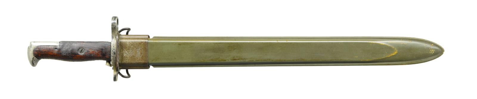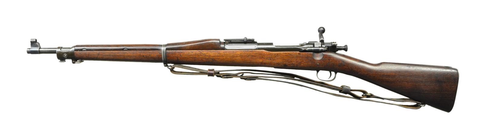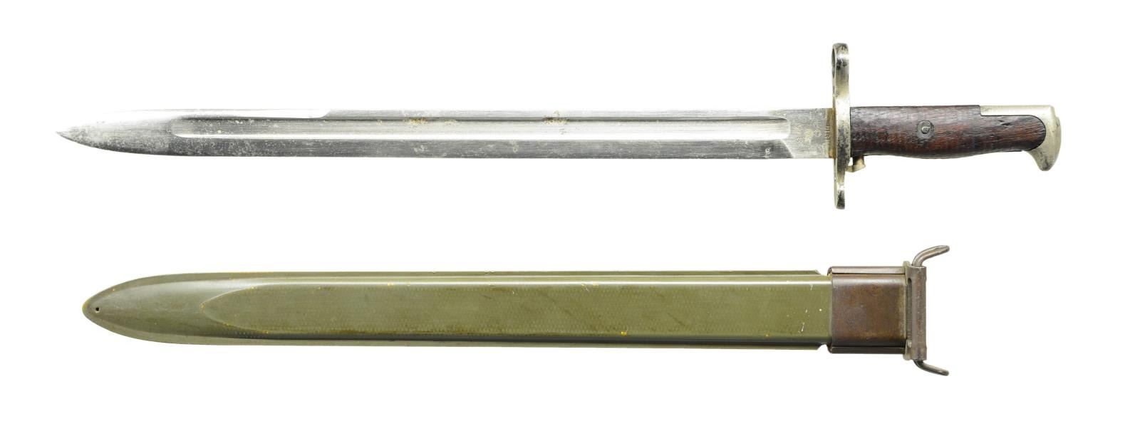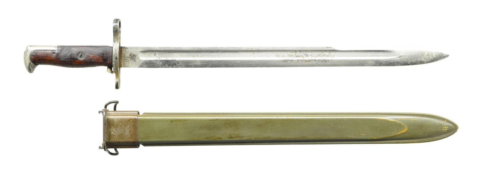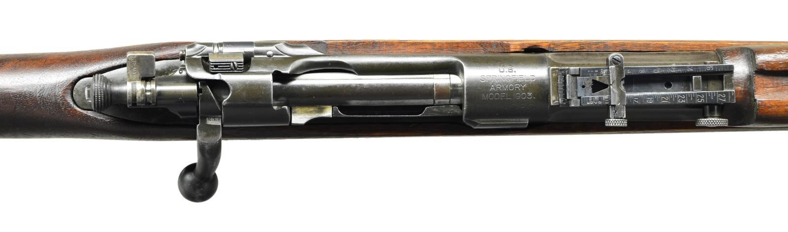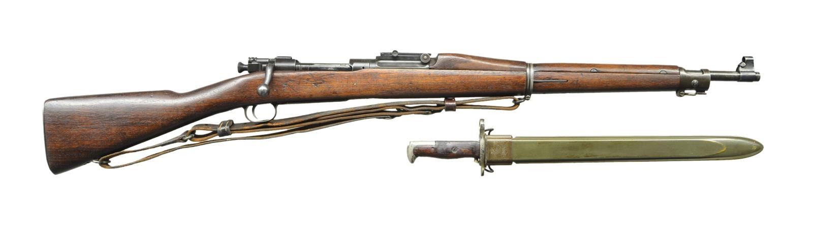 RIFLE. Cal. 30-06. S# 1418239. Bbl. 24" marked behind front sight "SA flaming bomb 9-32". Ladder rear sight graduated to 2850 yards w/ volley notch. Flat windage knob; dish elevation knob; blade front sight w/ sheet metal protective hood. Receiver does not have hatcher hole. Bolt w/ swept handle marked on top w/ "N.S.". Safety marked w/ blocked letters. All milled furniture including flat trap buttplate. Replacement walnut 1903A3 buttstock, w/ 2 reinforcing pins. Stock is marked on left side over trigger guard w/ "boxed FJA" & "crossed cannons". Marked under grip w/ "circle P" proof. Hand guard w/ sighting groove & 2 clips. Russet leather 1907 sling w/ faint, partly legible marking "1918" & "H.H.B.". UNATTACHED ACCESSORIES: nickel plated oiler in butt. Bayonet w/ 15 7/8" Fullard blade. Bright blade is marked on left ricasso "SA" (flaming bomb) "1914". Marked on right ricasso "US" plus S#. Coarse turned walnut grips. Green plastic scabbard marked "U.S." in flaming bomb. Bayonet has been lightly sharpened. Blade has scattered spots of oxidation & fine pitting. Balance of metal has oxidation & fine pitting. Grips have moderate wear, staining & handling marks. Scabbard is worn but serviceable. CONDITION: stock has legible markings w/ light to moderate wear, staining & handling marks. Hand guard has worn original finish w/ handling marks. Metal has worn thinning original Parkerization. Bore has worn lands & has darkened grooves ahead of chamber. (23-355/RW). CURIO. $400-600.