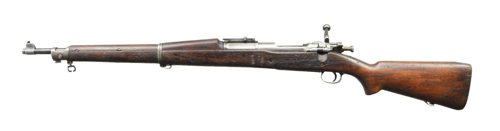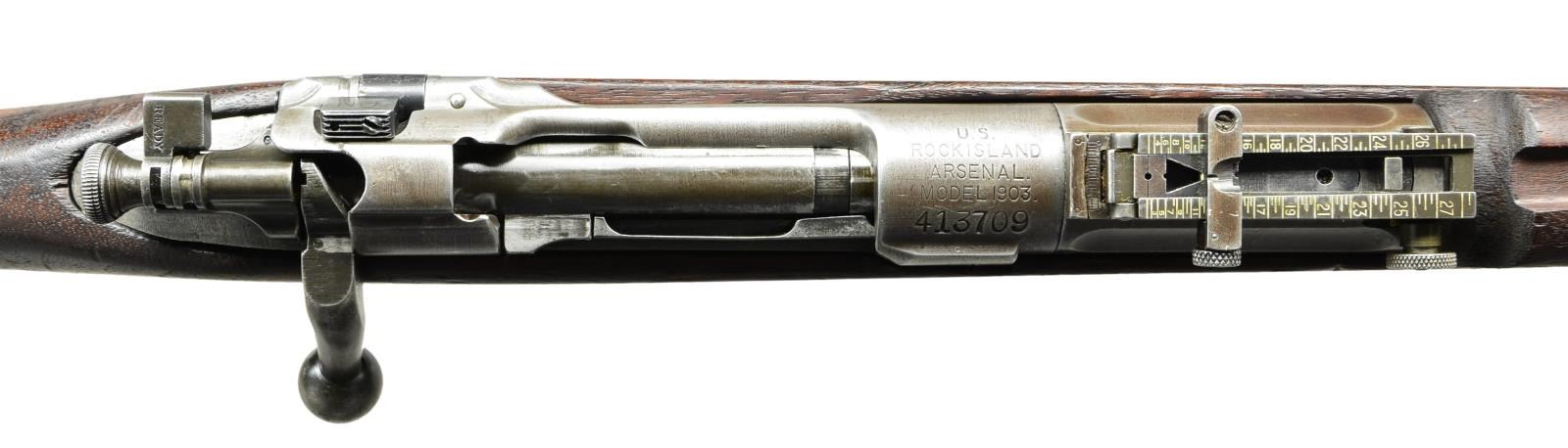 MILITARY RIFLE. Cal. 30-06. S# 413709. Bbl. 24". Marked behind front sight "SA flaming bomb 9-28". Ladder rear sight graduated to 2850 yards w/out volley notch. Graduations enhanced in white. Black windage knob; dish elevation knob; flat blade front sight. Rifle has been through 2 or more overhauls which resulted in a replacement bbl., stock & bolt. Rock Island marked receiver; not drilled for "Hatcher hole". Bolt w/ swept handle & smooth body is marked "R" underneath bolt handle & appears to be from early Remington 1903 production for WWII. Safety is marked "R". Unmarked cutoff w/ blocked letters. All milled furniture except stamped "R" marked stacking swivel. "C" Type pistol grip stock marked faintly on left side of trigger guard w/ "boxed S.A." & "S.P. / G." overhaul marking. Marked under grip w/ "encircled P" proof. Marked at end of grip w/ "boxed P" overhaul proof & also marked "AA" indicating additional overhaul at Augusta Arsenal in GA. All milled furniture w/ smooth trap buttplate. Handguard w/ sighting groove & 2 enforcing clips. CONDITION: stock set has extensive wear, staining & handling marks w/ crack on left side extending from trigger guard tang through grip area. Notable sm. missing chips at lower edge of grip. Worn metal has turned mostly gray w/ handling marks & scattered light pitting. Bore is shiny but w/ lightly worn lands. (23-627/RW). CURIO. $400-600.