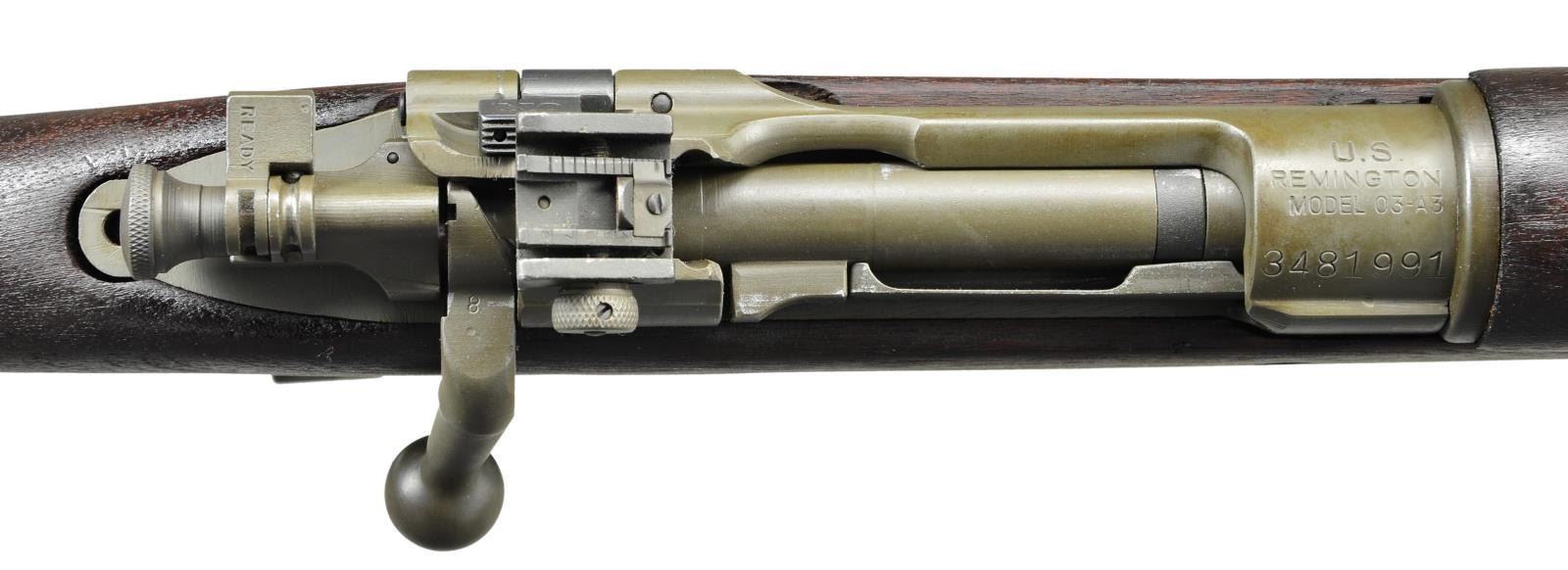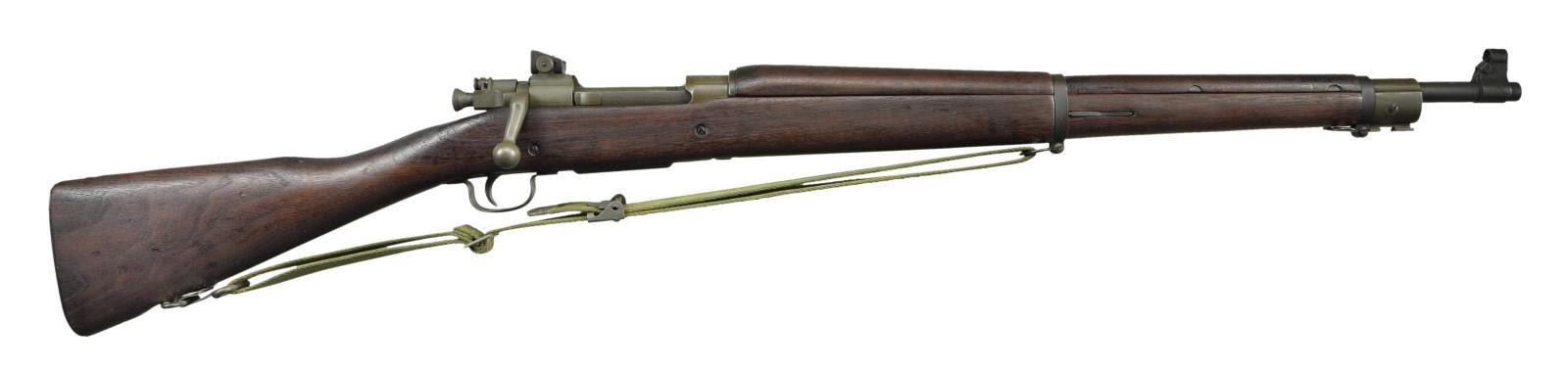 MILITARY RIFLE. Cal. 30-06. S# 3481991. Bbl. 24" marked behind front sight "RA" "flaming bomb" & "2-43". Adj. aperture rear sight graduated to 800 yards. Blade front sight w/ metal hood. Hood is marked on right side w/ "G" & left side w/ "C 64157-4". All stamped furniture including checkered trap buttplate & sm. bow trigger guard. Green web sling. Straight grip walnut stock set. Buttstock fitted w/ 2 recoil bolts. Buttstock is marked only w/ boxed "O.G." in the cheek area on the left side. This would indicate an overhaul at the Ogden Utah Arsenal. Stock is additionally marked on left side "SS". CONDITION: wood & metal retain a very high degree of arsenal rework finish including the greenish parkerization w/ light high point wear & tiny scattered handling marks. Near excellent shiny 4 groove bbl. (23-596/RW). CURIO. MODERN. $500-800.