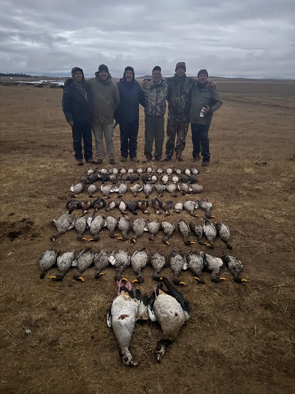 Goose shooting is done in screen blinds or lay-in blinds on reaped corn fields with a large decoy spread. The Spurwing Goose is one of the biggest in the world weighing close to 20 pounds. The hard beating sound from the wings of these huge geese is deafening when 100 or more put their landing gear out to land amongst the decoys. Expect 10 birds per gun per shoot.