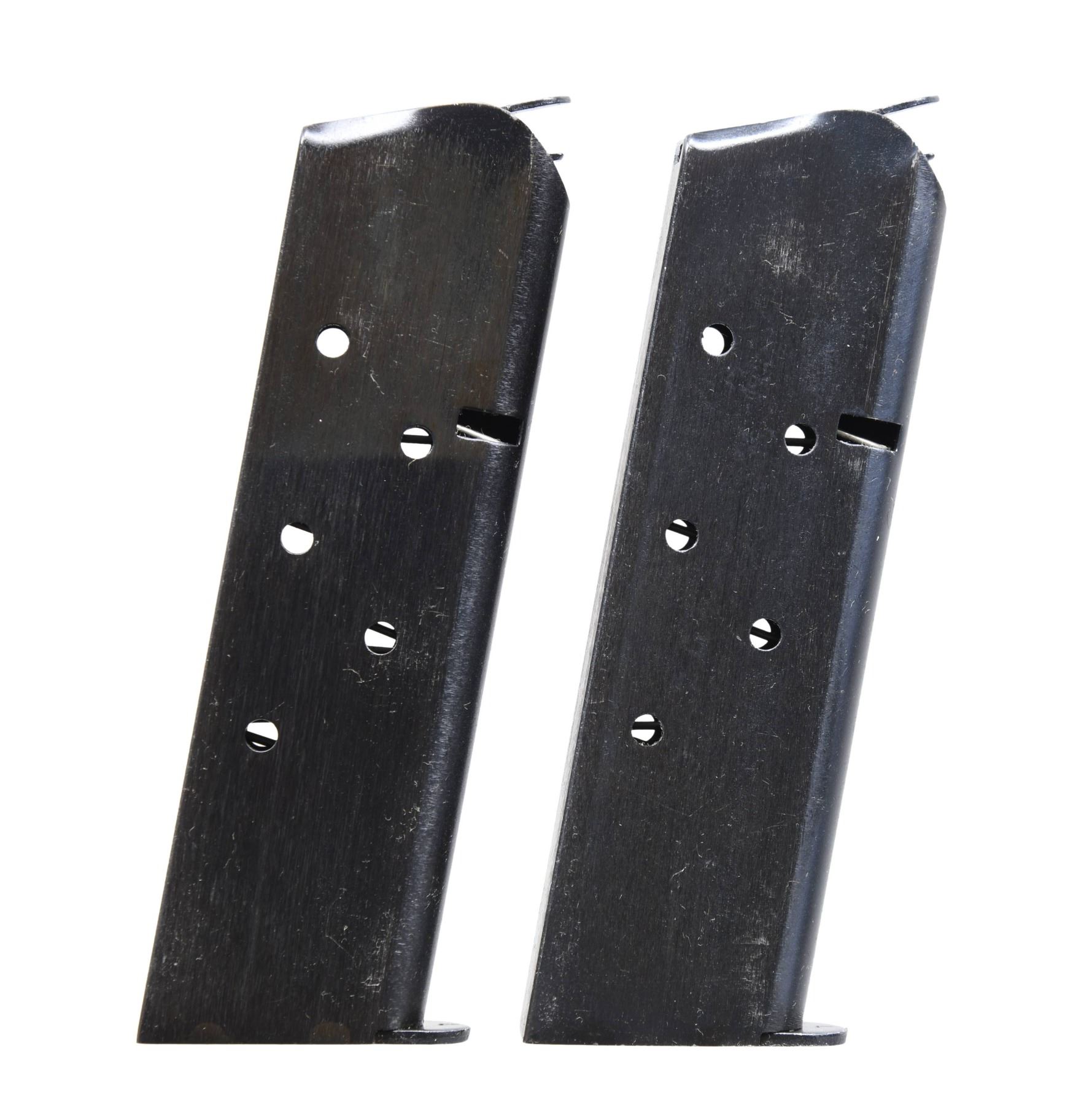PISTOL & ORIGINAL BOX FROM THE CHARLES W. CLAWSON PRIVATE COLLECTION. Cal. 45 ACP. S# 2445274. This pistol comes with a Certificate of Authenticity indicating S# 2445274 from the Collection of Charles W. Clawson, a foremost authority on 1911 pistols & notable author of 1911 reference books including Colt .45 Service Pistols & Colt. .45 Commercial Models. This pistol was mfg. July 1945 having correct parts including rare Flannery 5" barrel, correctly polished feed ramp, Keyes Fiber grips having a star and number "19" w/ reinforcing rings around screw holes. Frame has "FJA" inspectors mark. MAGS: 3 MS Little 7 rd. in unissued condition. UNATTACHED ACCCESSORIES: correct Remington Rand box. Also includes paperwork including COA. The COA, filled out by Betty A Clawson, has the make erroneously marked "Colt", with the matching S# for the pistol and COA allocated to Remington Rand, along with the correct Remington Rand slide and frame. CONDITION: this pistol has a minty overall appearance showing 99% parkerized and blued finish showing minimal cycling wear. Bore is minty with strong rifling. (24-4460/MD). CURIO. $4,000-5,000.