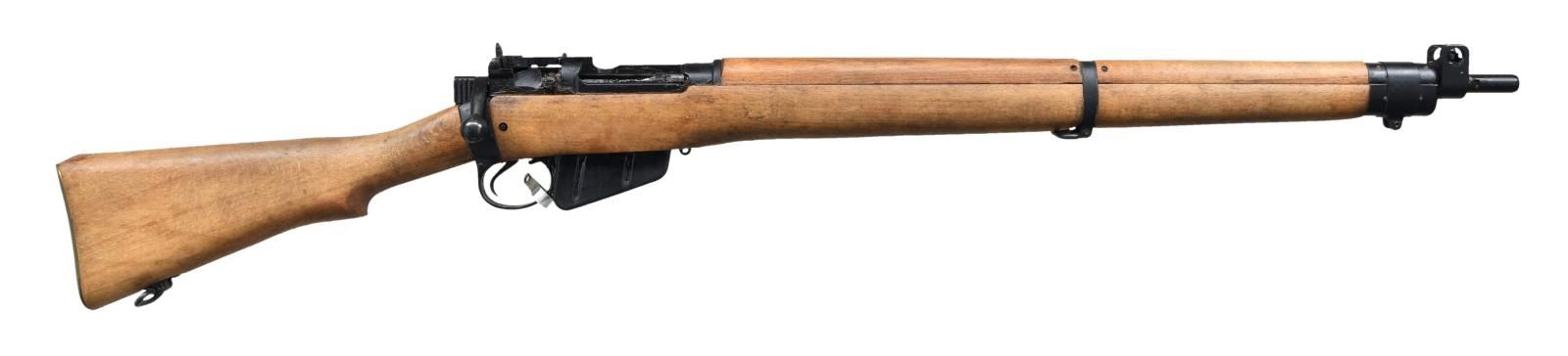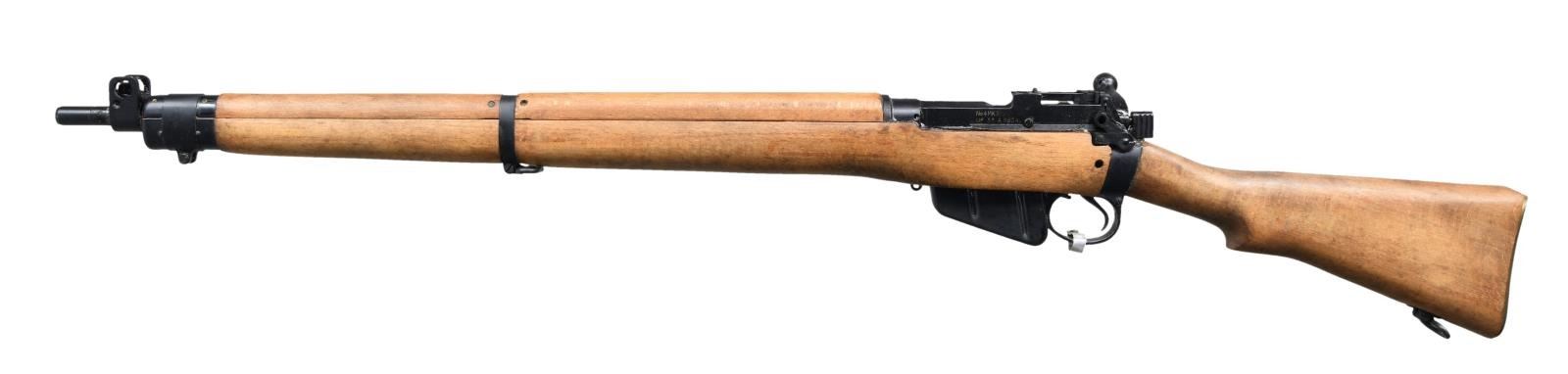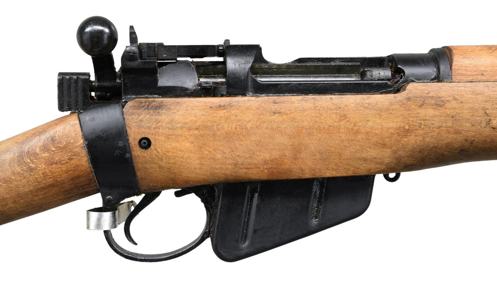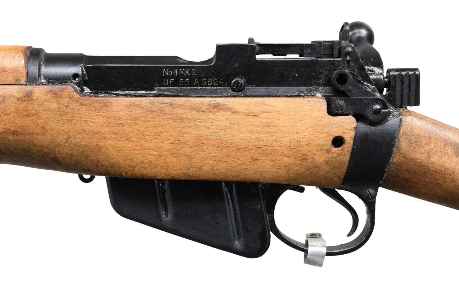 Cal. 303 Brit. S# A5824. Bbl. 25 1/2" w/ Century import marking. High condition No. 4 MKII rifle that appears unissued. All visible matching numbers. Left side rail has No. 4 MK2 & UF 55 markings denoting Fazakerley arsenal mfg. in 1955. Aperture rear sight graduated to 1300yds. Blade front sight w/ protective ears. Metal tag present on trigger guard. Beech stock set w/ bottom mounted sling swivels. UNATTACHED ACCESSORIES: 1-10 rd. matching numbered to gun. CONDITION: stock set shows light handling wear & some minor staining. Action has a heavy amount of cosmoline present. Metal retains 98% original Suncorite finish. Greased bore that will likely clean up well. (23-1155/MJC). CURIO. $400-600.