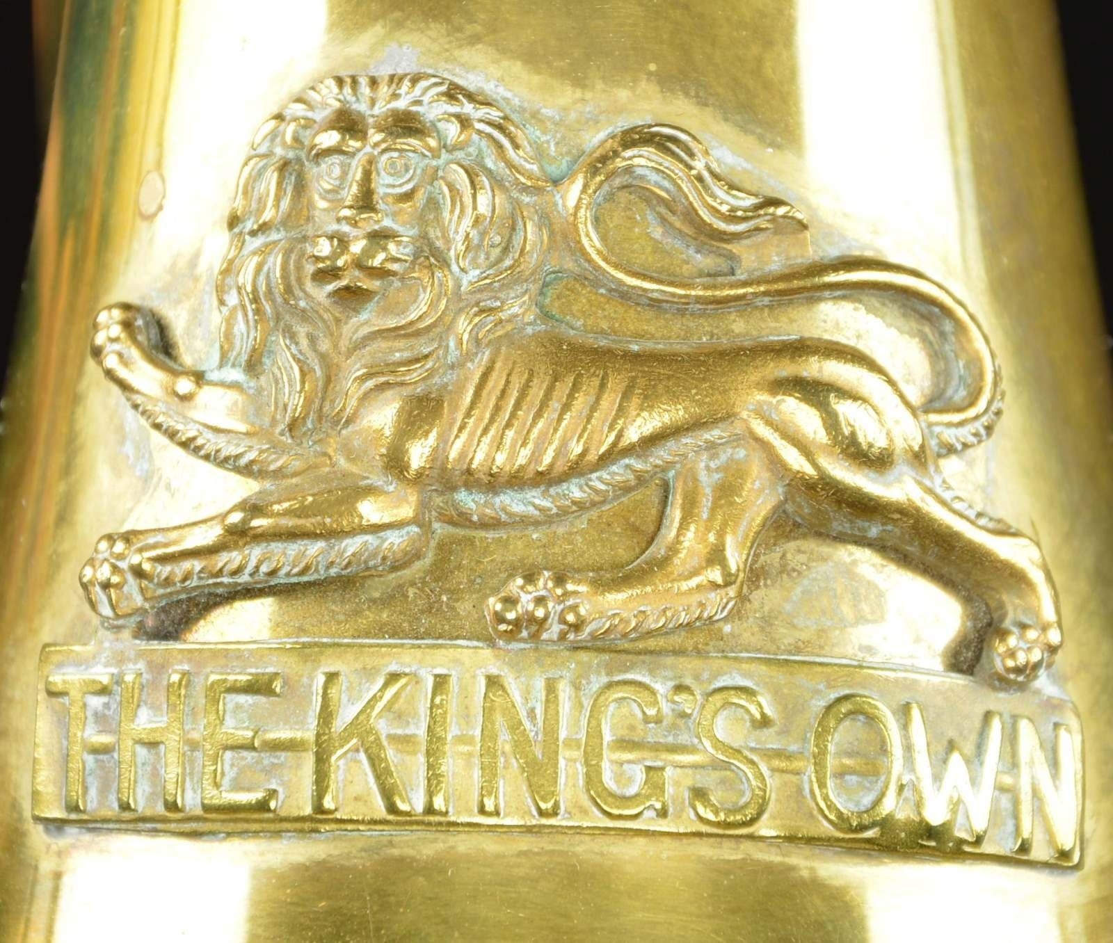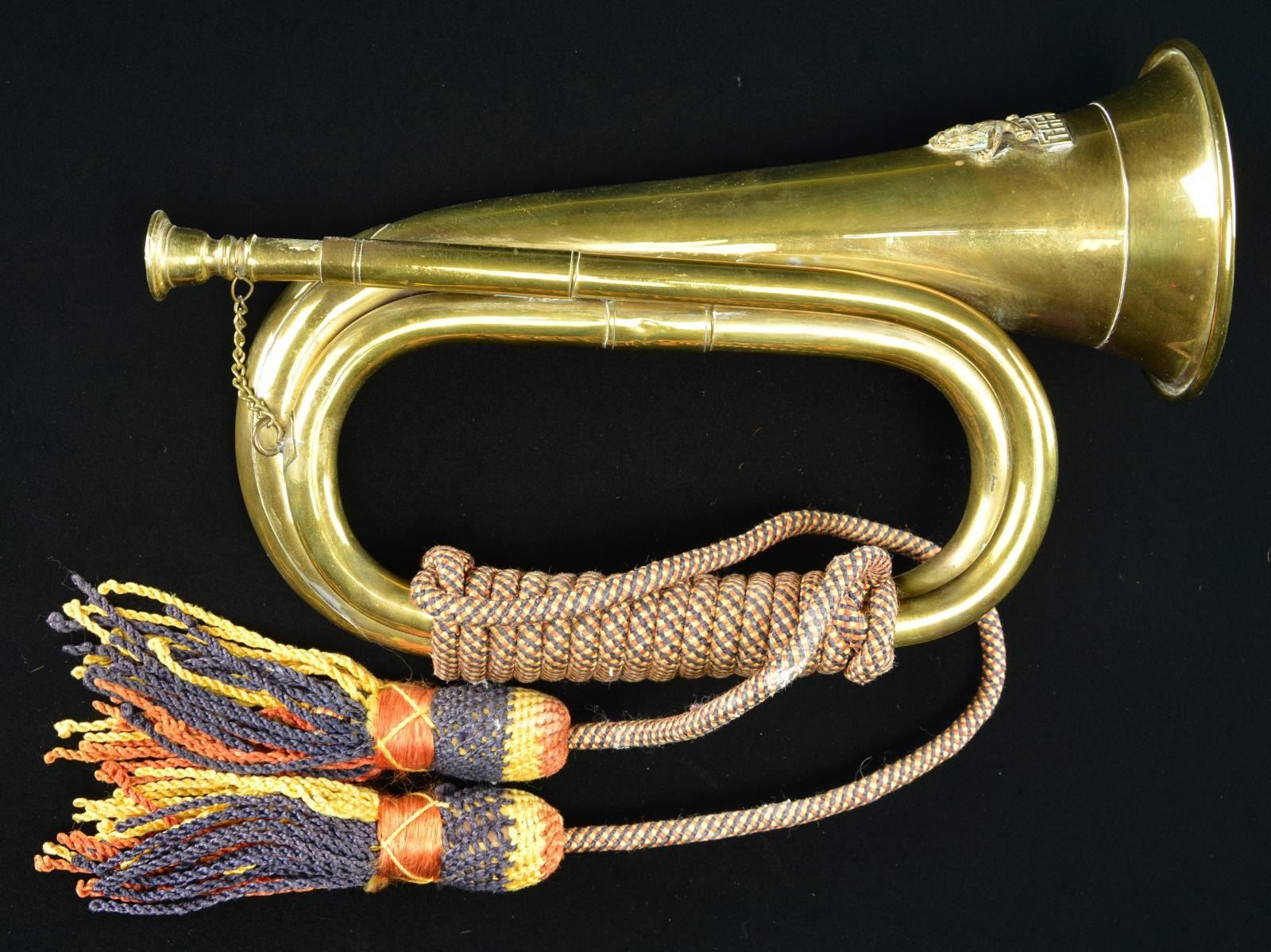 Overall: 11 1/2". Mouthpiece has retaining chain. Yellow, bronze & black tassel. CONDITION: good overall w/ light patina, verdigris & marks. (02-19402/MD). $125-175.