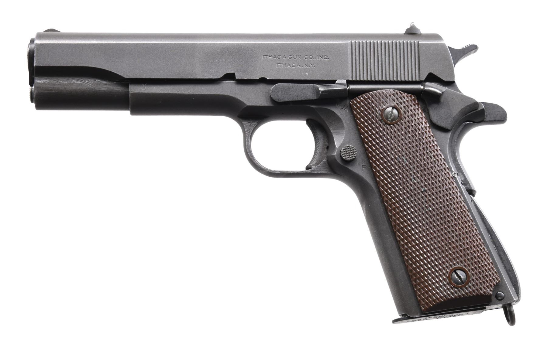 Cal. 45 ACP. S# 2627268. Mfg. 1945 within S# block 2,619,014 - 2,693,613. Appears to have all correct parts including High Standard 5" barrel & Keyes Fiber Type 10 grips. MAGS: 1 Vietnam Era 7 rd. mag. CONDITION: very good original parkerized finish showing light cycling wear, edge wear & scratches. Pistol shows slide lock scratches along with several punch marks on left side of frame around grip safety. Very good grips with 1 notable gouge, scattered flattened diamonds & distortion to 2 of the grip screws. Barrel shows good blue & shiny bore with strong rifling. (24-5348/MD). CURIO. $1,750-2,500.