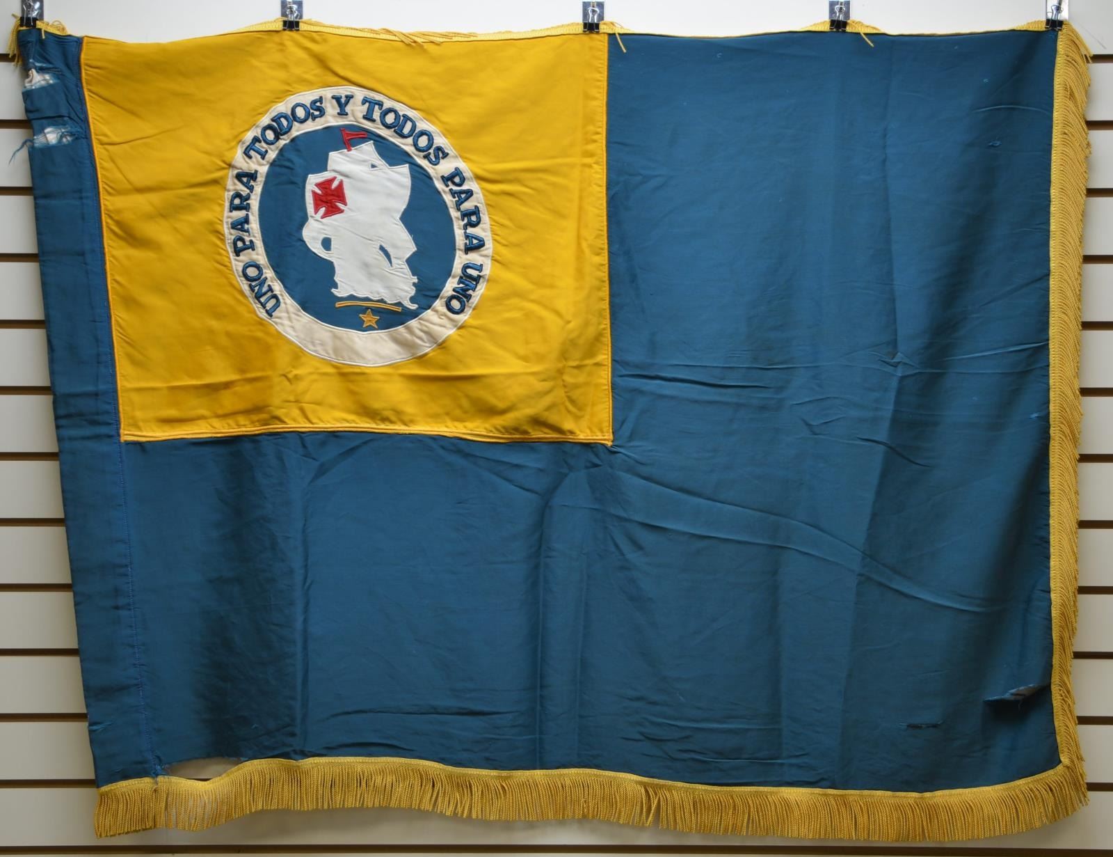 3’ x 4’ teal & blue, motto: “UNO PARA TUDOS Y TODOS PARA UNO”, “One for All & All for One”, circa 1970. With the construction of the Panama Canal, the U.S. military, since 1903, has long had a presence in Panama to protect this vital waterway. As such, it helped the Army focus on issues from the Caribbean to South America and the U.S. Army Caribbean Defense Command was created. Besides training U.S. troops for service in this region, they also reached out to the militaries of the many nations to build trust and offer training to their officers and troops. On June 11, 1963, the Kennedy Administration changed the name, and focus, of this command to the U.S. Army Southern Command. Now headquartered in Miami, Florida, the mission remains the same; defending the southern region of the United States and helping friendly nations deal with defense issues. All other U.S. military branches have involvement within this command. U.S. Army Training, Southern Command (SOUTHCOM). The ship is a reminder of Christopher Columbus’ discovery of the New World in 1492. The ship is the central device on the SOUTHCOM flag and it also adorns the shoulder patches for troops assigned to this command. CONDITION: good to very good overall, several tears on hoist and fly edge, good colors. (02-17547-27/JS). $100-200.