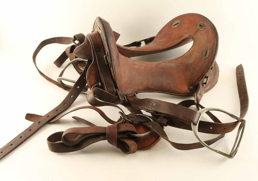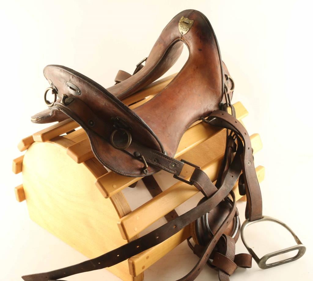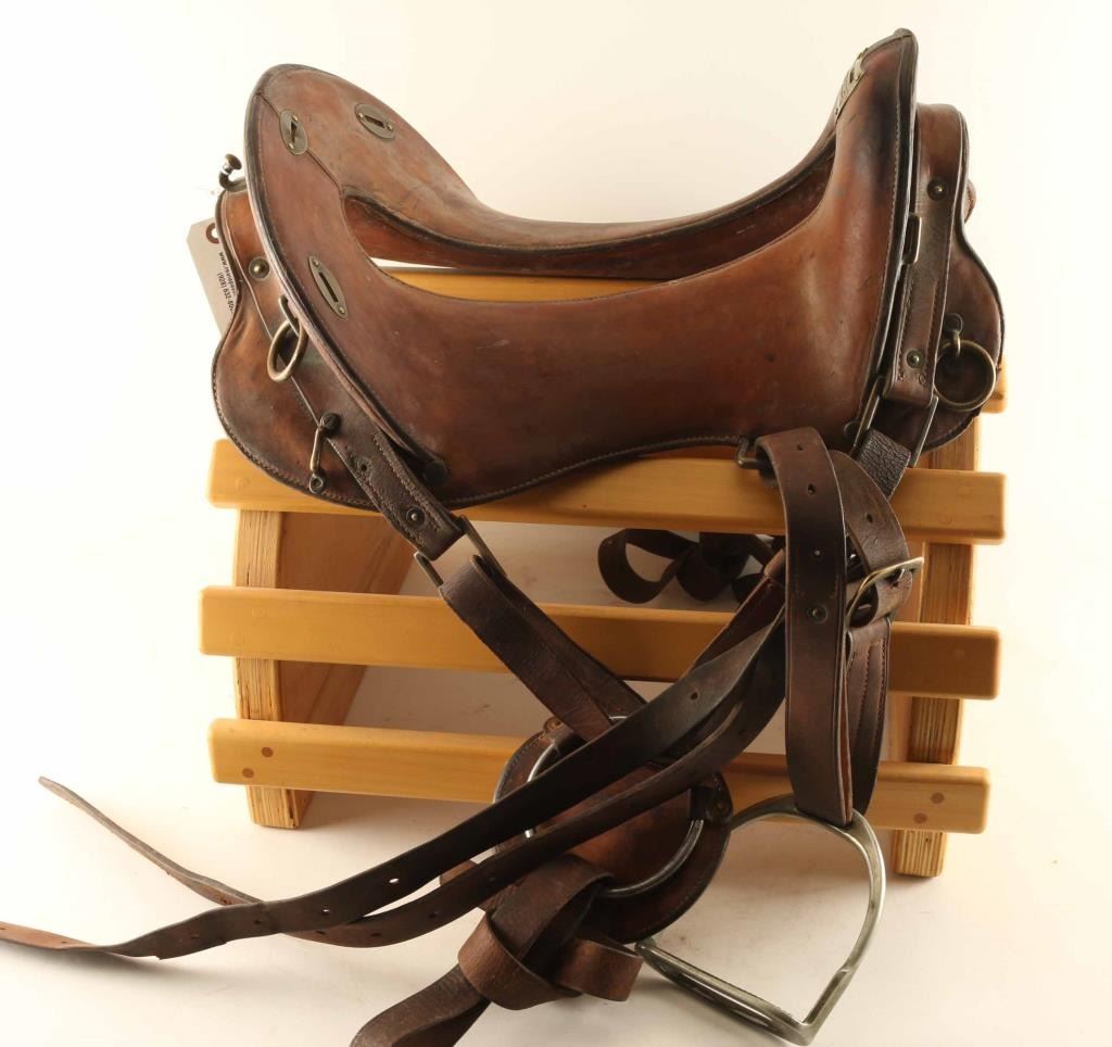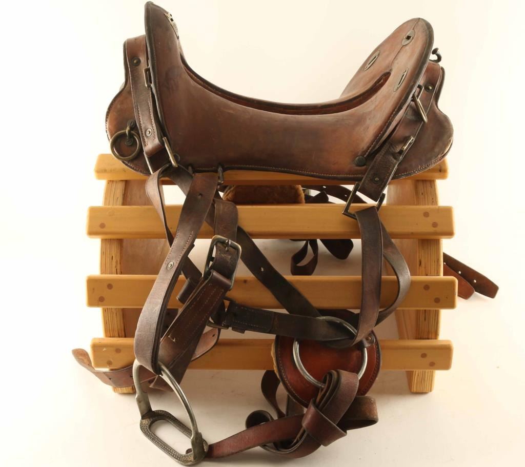 Has an 11 1/2" seat with traditional smooth brown leather with stirrups and straps. In fair condition with some loses to stitching.