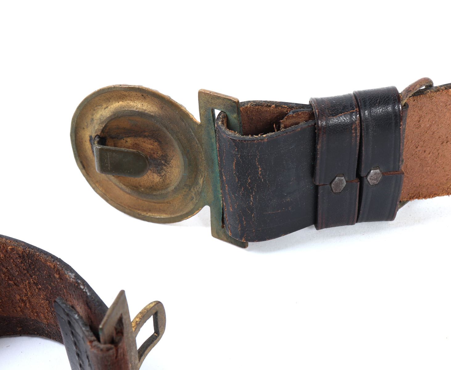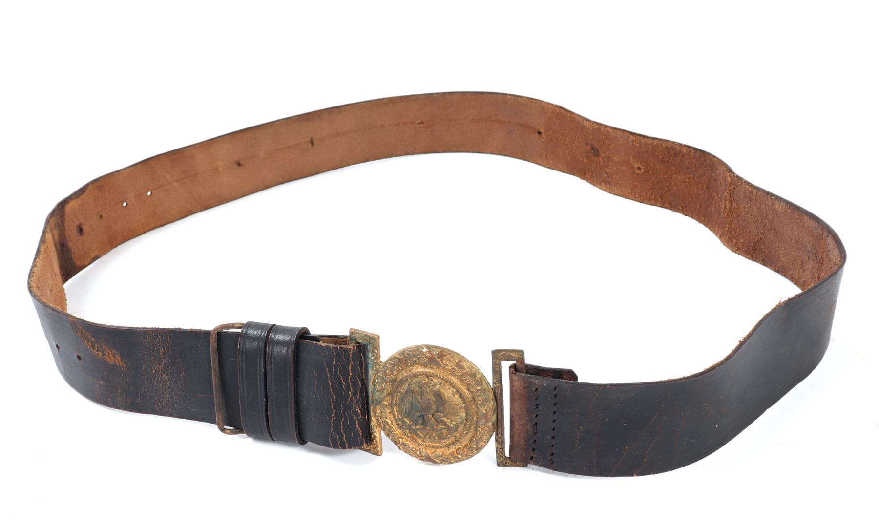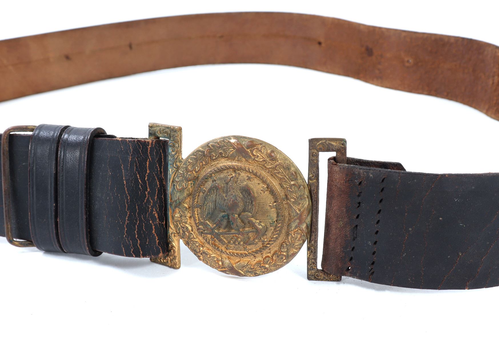 Fine US Civil War Navy belt of the mid-19th-century. The set consists of a leather belt showing wear from use and a brass buckle featuring a detailed federal eagle emblem. Size 44 5/8" L, Buckle 2" W. Provenance: Ex-Southern California Collection
