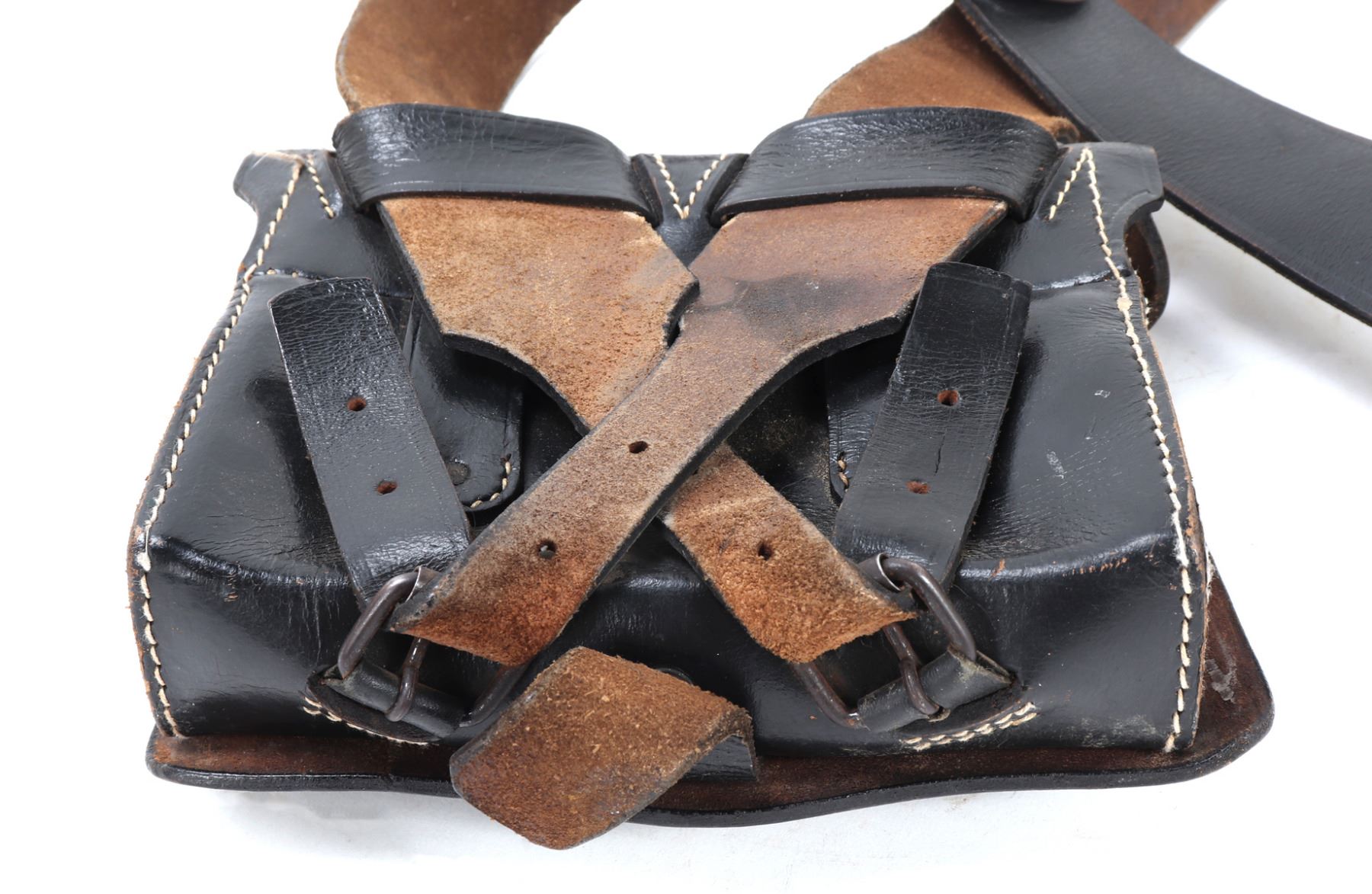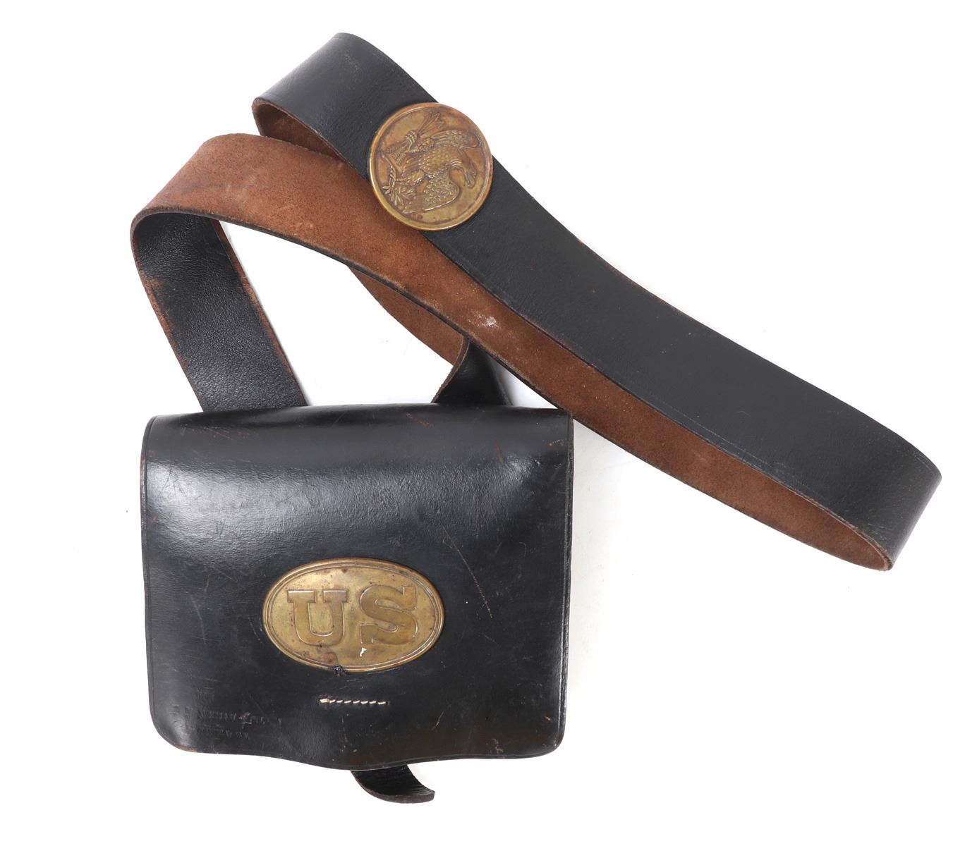 Nice old complete set of US Civil War replica leather cartridge box with brass buckle and belt. Each piece is crafted to reflect the historical designs used during the American Civil War, offering an authentic look for collectors or reenactors. Size Pouch 8 1/4" W x 7" L, 31 1/4" L with strap. Provenance: Ex-Southern California Collection