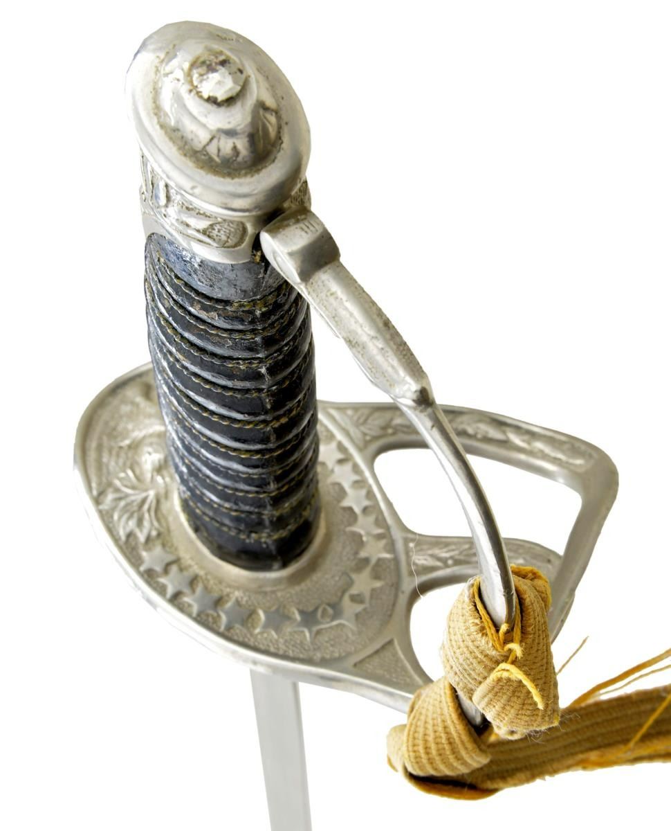 Overall length: 40 3/4". Blade length: 33 1/2". Plain blade with a single narrow fuller. Plated brass hilt featuring a 2-branch guard. The top of the guard is decorated with an American eagle and 13 stars. The underside of the guard has a series of rays. The pommel has an American shield & foliate motif. Wire-wrapped leather grip. There is a cloth sword knot tied to the guard. Plated scabbard. CONDITION: blade shows original factory polish. Hilt is slightly bent but plating is complete. Wire & grip show only light wear. Scabbard shows light wear but is missing both drag screws. (02-19379/BF). $200-300.