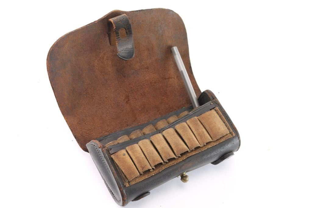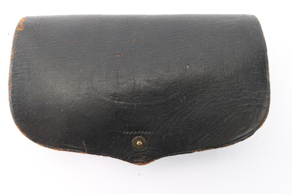 Rare early Indian War Era M1872 US Army Cavalry No. 2 Hagner Leather Cartridge box. Early 1870's Holds 24 .50-70 rounds. Embossed on the cover with US in oval, and having the swell in the side for a combination tool. Marked on the top section of box, “No.2,” and " A.R.S.” (the later for A.R. Smith, inspector) on the closure strap. Makings are feint from use. Has the Original Model 1879 Combination Tool for the 45-70 Trapdoor. Stamped "US Mod 1879". Complete with all stitching intact.