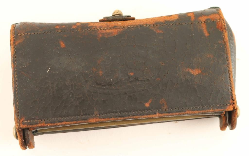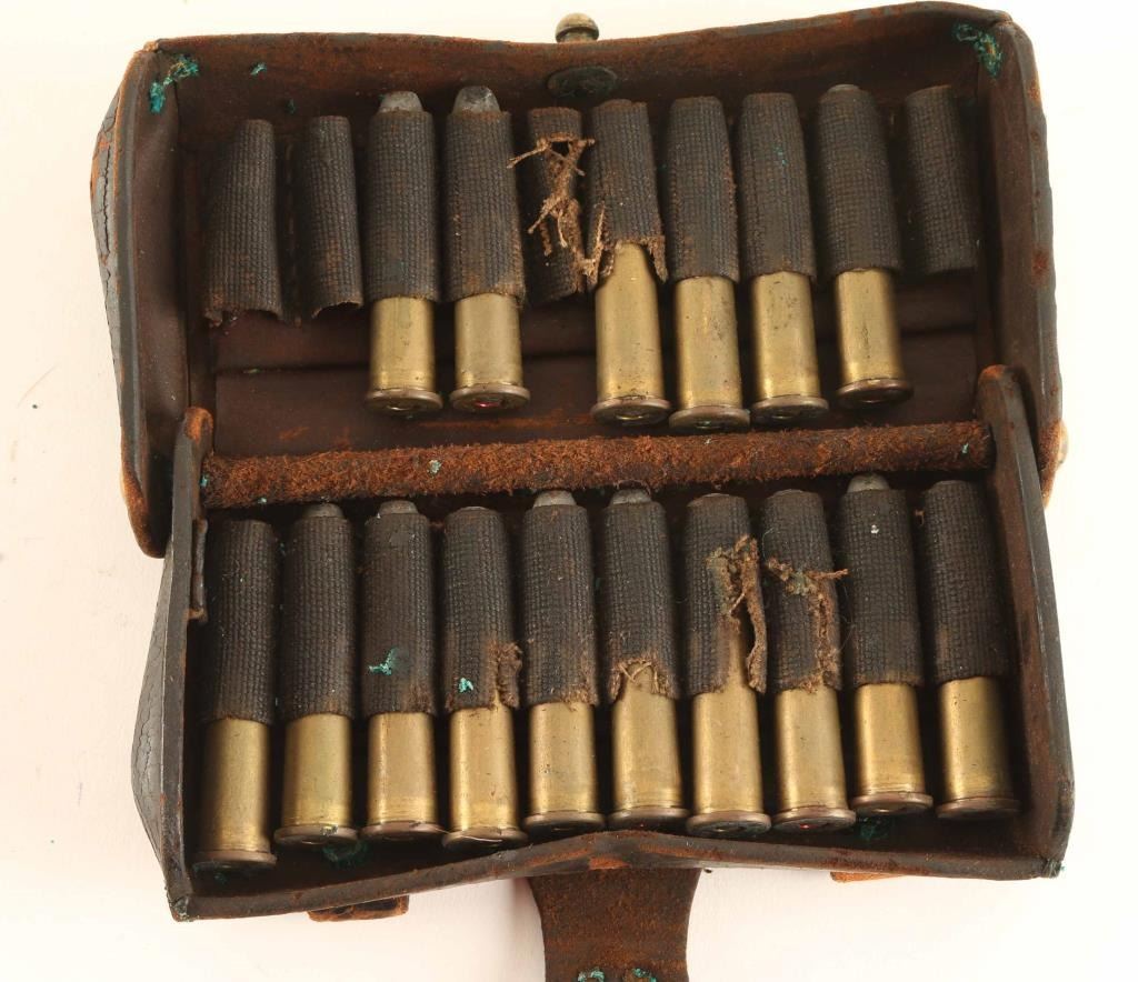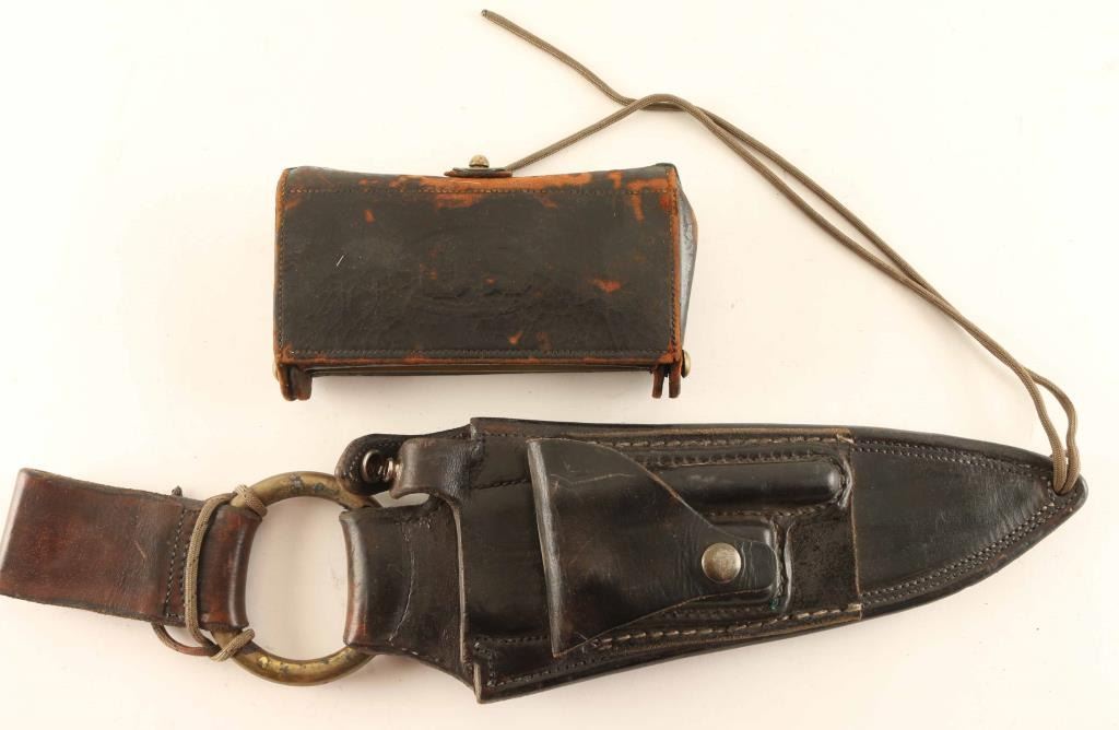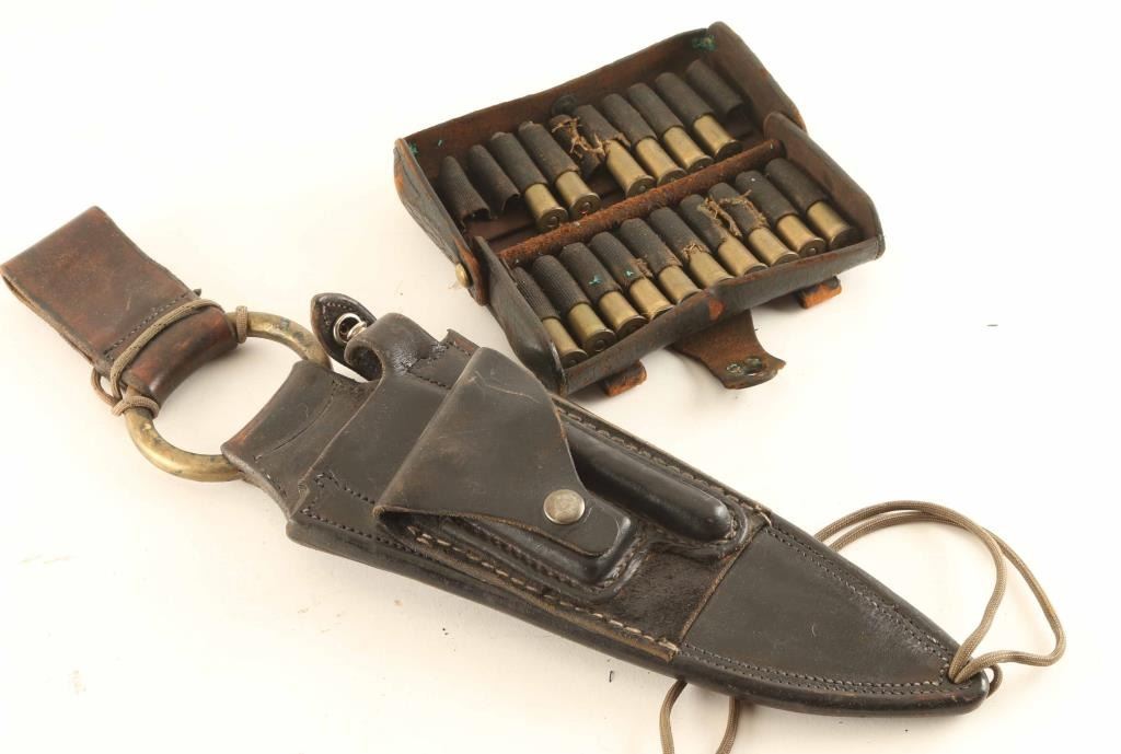 Authentic US marked Ammo pouch for a Springfield with 16rds of 45-70 blanks inside the pouch, shows age but still in very good+ condition. Also includes unknown knife sheath, beautifully done and shows signs of age, also in very good+ condition.