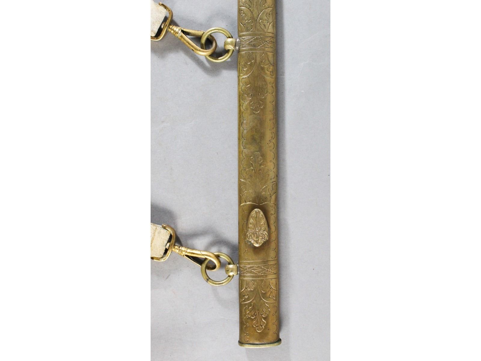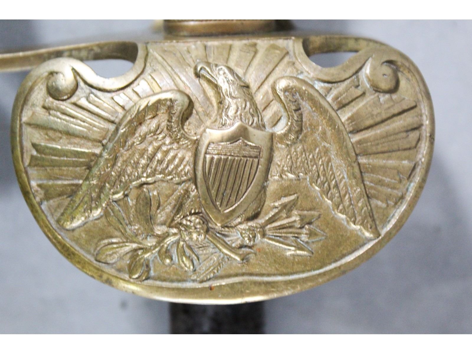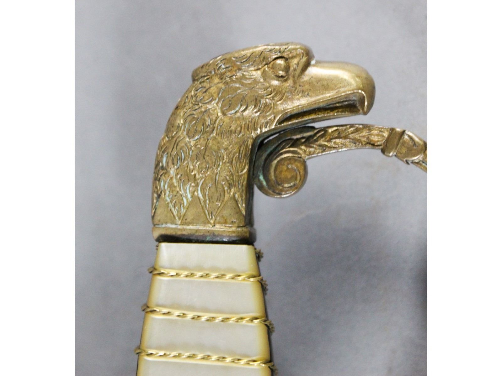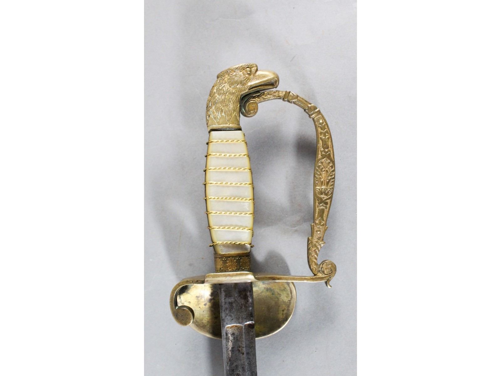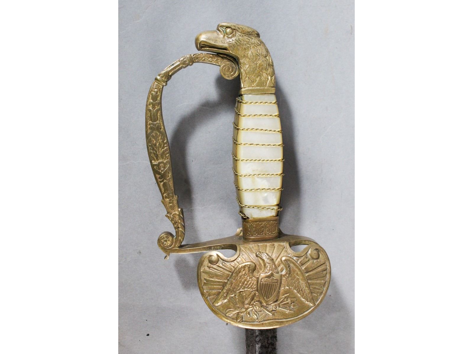 Nice eagle with pommel with full spread wing eagle on turned down guard. Mother of pearl grips with brass wire. Lightly engraved blade with dark stains. Fancy engraved brass scabbard. Still has partial light buff leather hangers. Circa 1830. Very good condition.