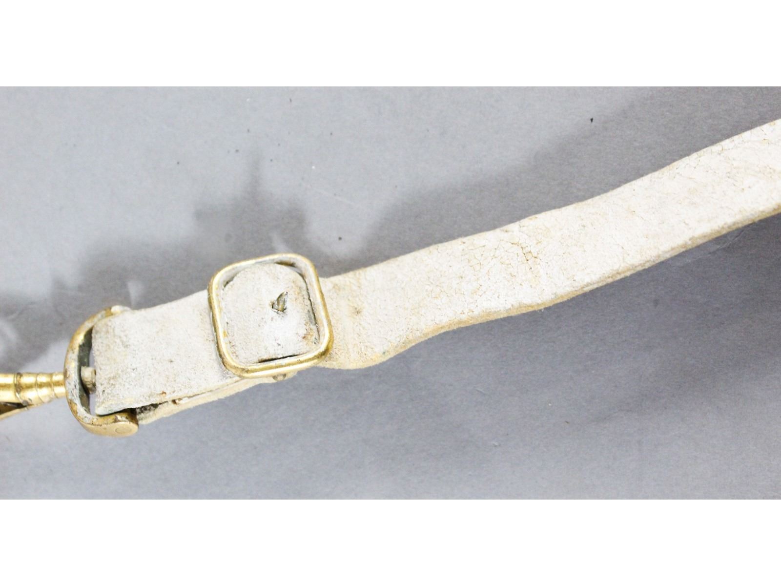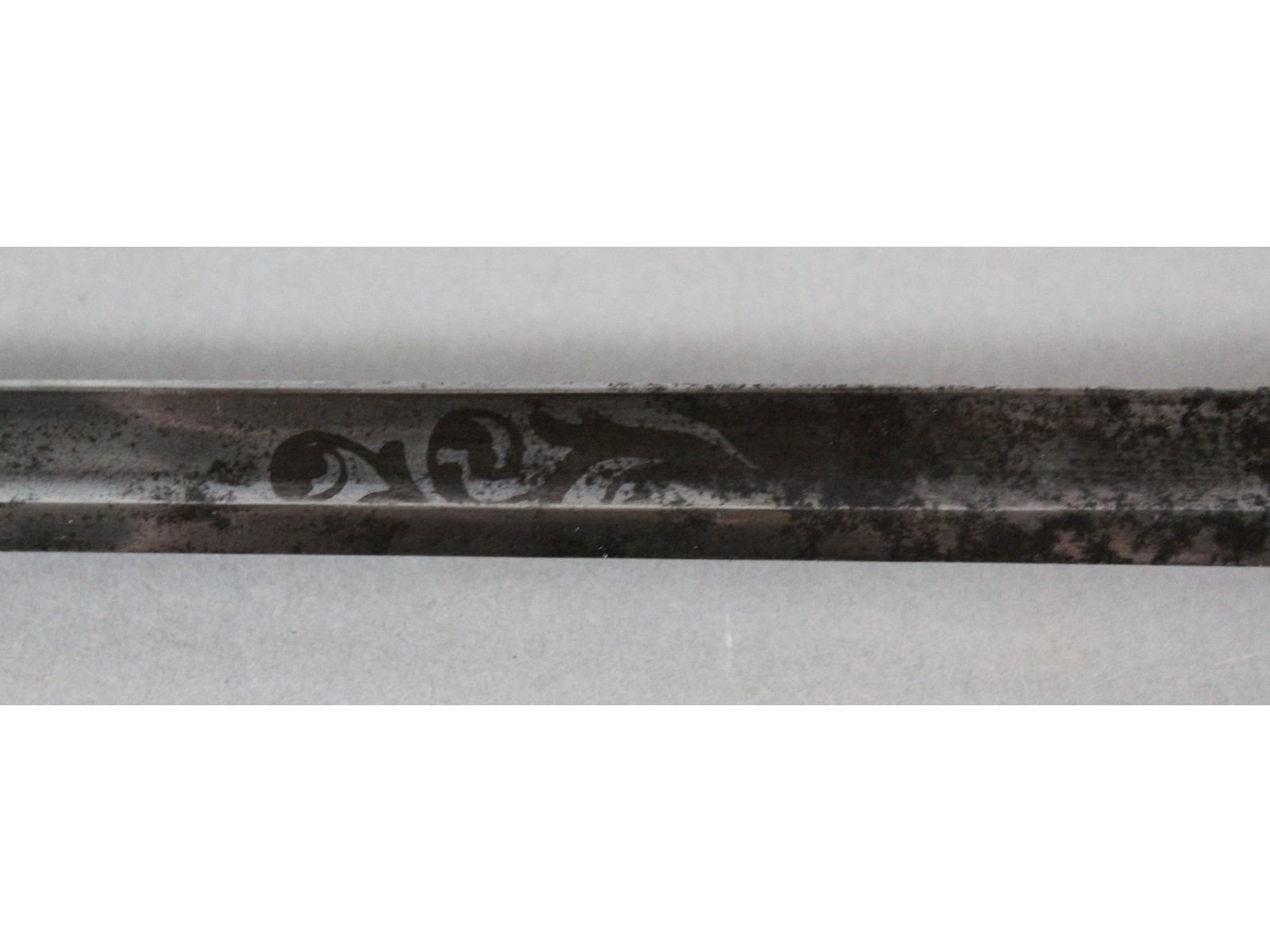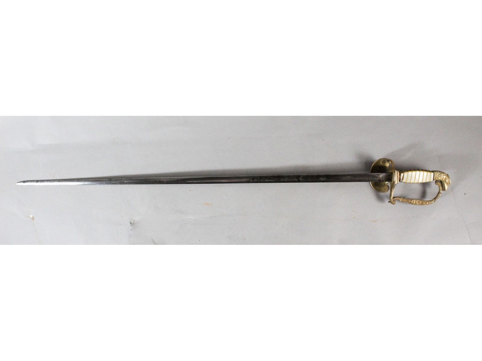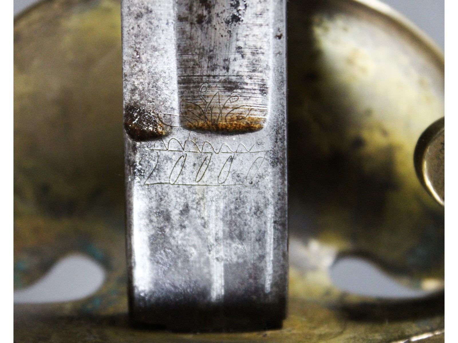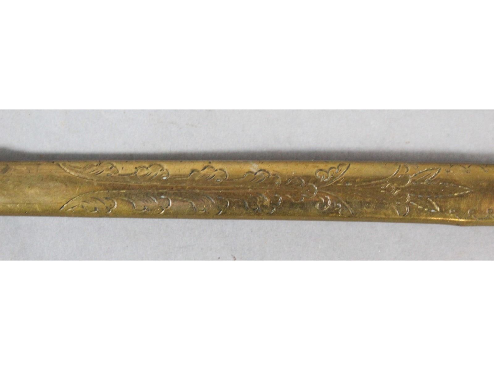 Nice eagle with pommel with full spread wing eagle on turned down guard. Mother of pearl grips with brass wire. Lightly engraved blade with dark stains. Fancy engraved brass scabbard. Still has partial light buff leather hangers. Circa 1830. Very good condition.