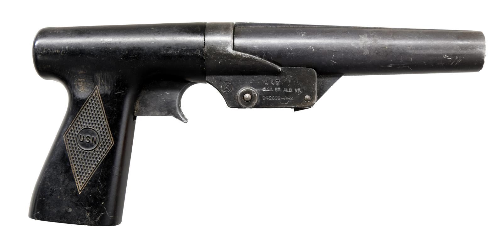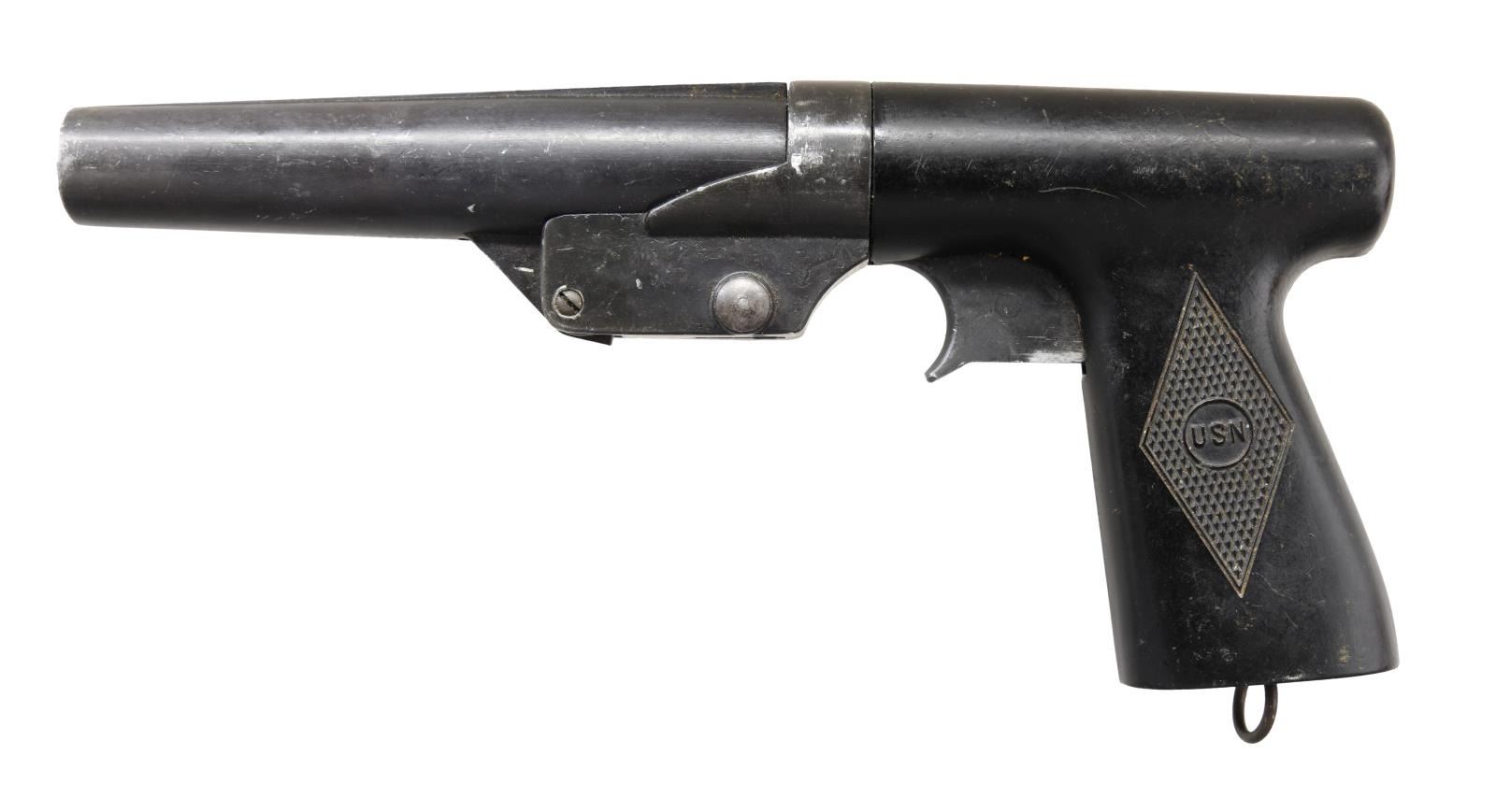 Cal. 10 Ga. S# 242692-A-2. Bbl. 6", marked on top "SIGNAL PISTOL MARK V" "R.F. SEDGLEY INC. 1943". Frame marked on the right side w/ encircled "S", "447" & CAI import mark. Checkered composite grip marked on both sides "USN". DAO trigger mfg. w/ out trigger guard. Lanyard ring on butt. CONDITION: Good overall appearance w/ numerous handling marks & lightly worn metal finish. Good bore. (23-1811/MD). CURIO. $200-300.