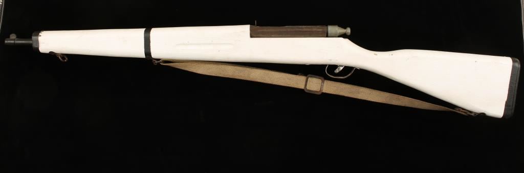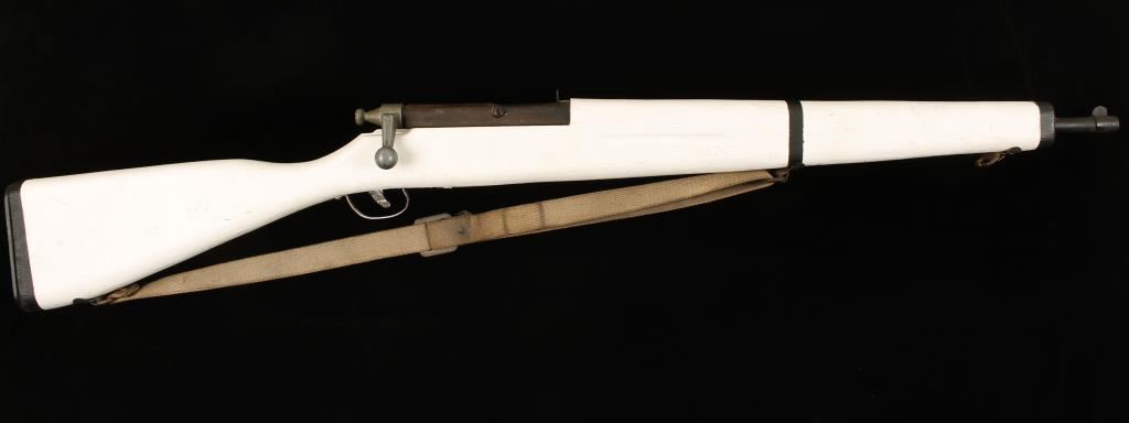 Modeled after the Springfield 1903. Painted white for the Navy. Blued metal has turned plum with surface rust. White paint has some dirty spots.