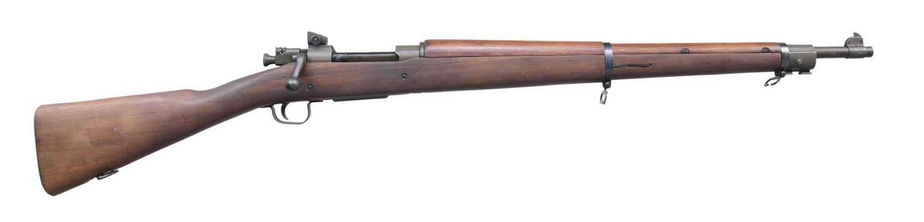 Cal. 30-06. S# 4040686. Bbl. 24". Remington 9-43 dated with flaming bomb. Blade front sight. Adjustable aperture rear sight graduated to 800yds. Sights, bolt parts, mag cutoff, trigger guard, stock, and both bands are all of Remington mfg. Bolt body, mag cutoff, and rear band are blued; other parts are parkerized. Walnut stock with bottom-mounted sling swivels. No visible stock markings. CONDITION: stock set shows some flaking finish, some dings, and handling marks. Metal retains 95% arsenal parkerized and blued finishes with some scattered edge wear. Action functions properly when hand-cycled. Very good+, bright bore. (24-5392/MJC). CURIO. $800-1,200.