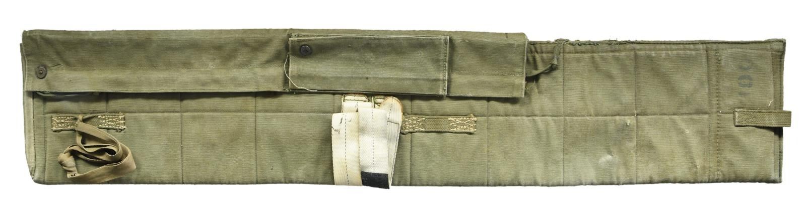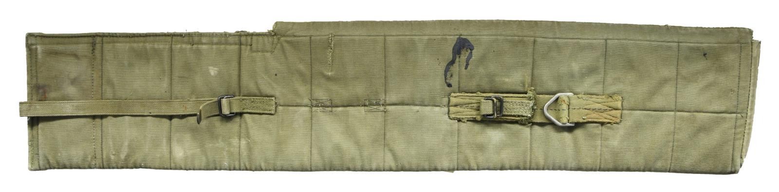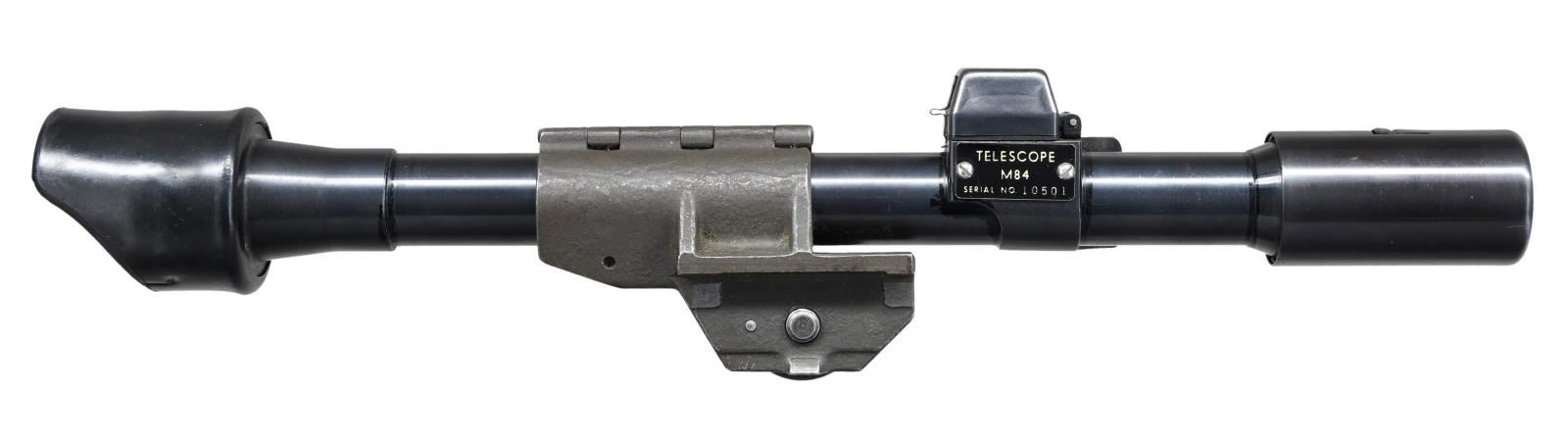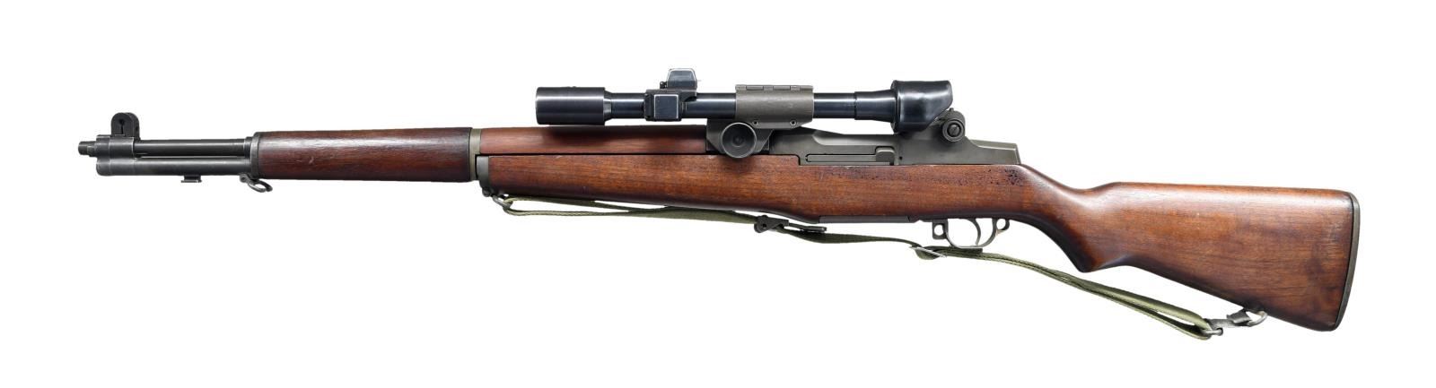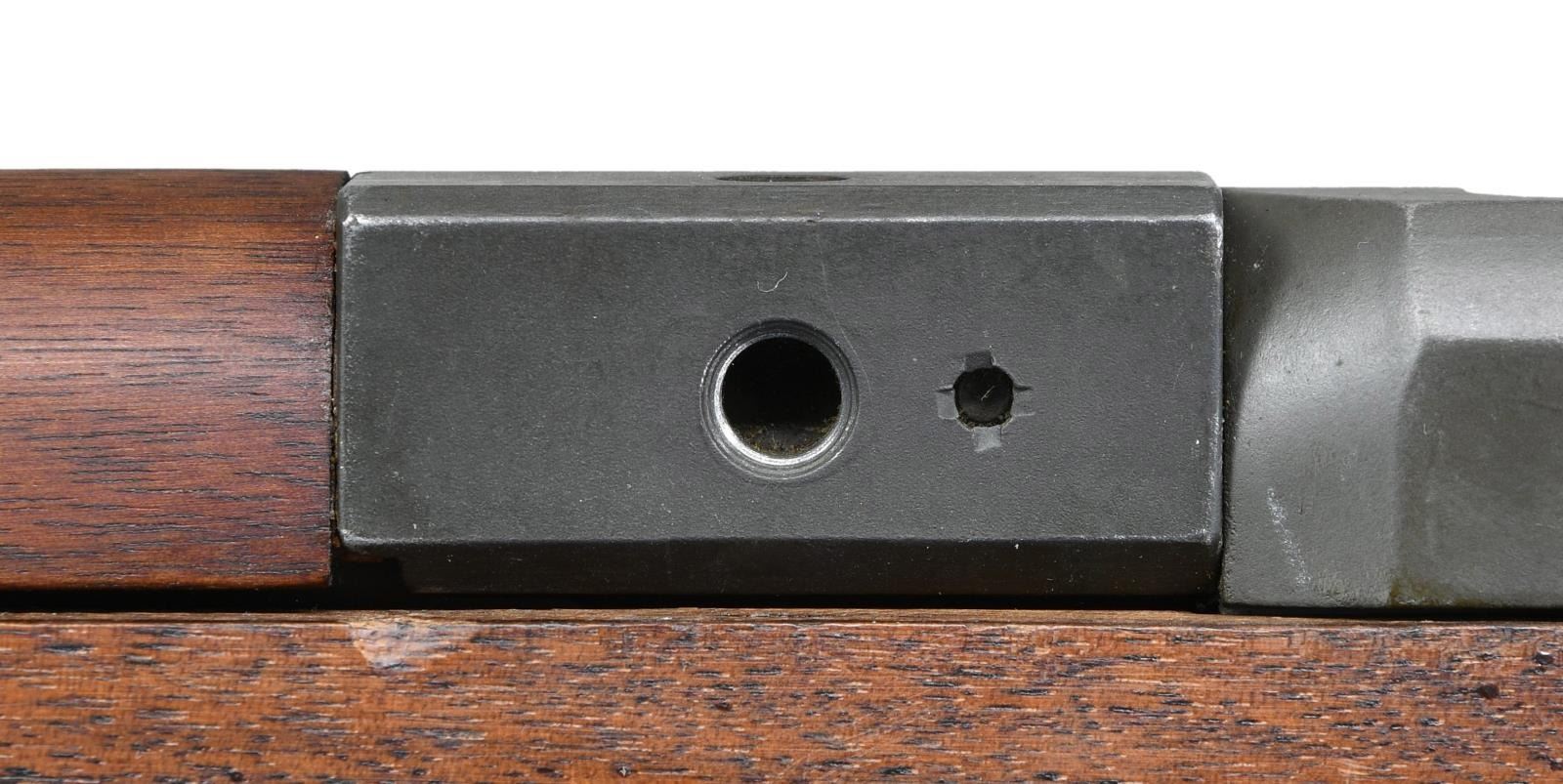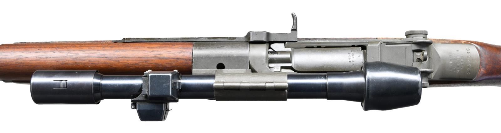 RIFLE W/ REPLICA M84 SCOPE. Cal. 30-06. S# 3352585. Bbl. 24". Throat gauges 2.0. Muzzle gauges 1.0. Barrel marked S-A-8-52 on the right side and marked faintly underneath in electro pencil ORION 8/5 Z583. Barrel marked on top under handguard with correct drawing number D7312555 and A174A with faint "crossed cannons. Late type aperture rear sight. Blade front sight with protective ears. Receiver, barrel, bolt,op-rod, trigger housing and hammer marked SA. Cross slot gas cylinder lock screw. Hi-hump gas cylinder lock. Milled trigger guard. Walnut stock set. Buttstock marked on left side over trigger guard with "crossed cannons". Marked under grip with encircled "P". Belly of buttstock has two screw holes from cheek pad installation. Green web sling. Original scope base is fitted with a reproduction scope mount. The mount has a more coarse finish than the originals and has a small encircled "M" on the left side. The cap screws require a 5/64" wrench. The thumb knob is welded but does have 50 clicks. The blued steel M84 scope has a non tapered post and cross hair. The features of the scope appear correct including the rounded forward edge of the sliding sunshade, the "L" and the"R" are placed correctly and the nameplate has white lettering without borders and a S# of 10501. UNATTACHED ACCESSORIES: includes copy of FM 23-10 U.S. RIFLE CALIBER .30 M1903. Dated 1943. Green canvas padded case marked "Case individual parachutist 1950". Cleaning kit and plastic oiler in butt. CONDITION: Stock set has an early "arsenal rework" finish with a slight loss of wood in inletted areas. Buttstock has had a small amount of wood removed between stock and receiver. Metal retains a large degree of "arsenal rework" parkerization. Optics appear clear and serviceable. Very good shiny bore. (23-918/RW). CURIO. $1,500-2,250.