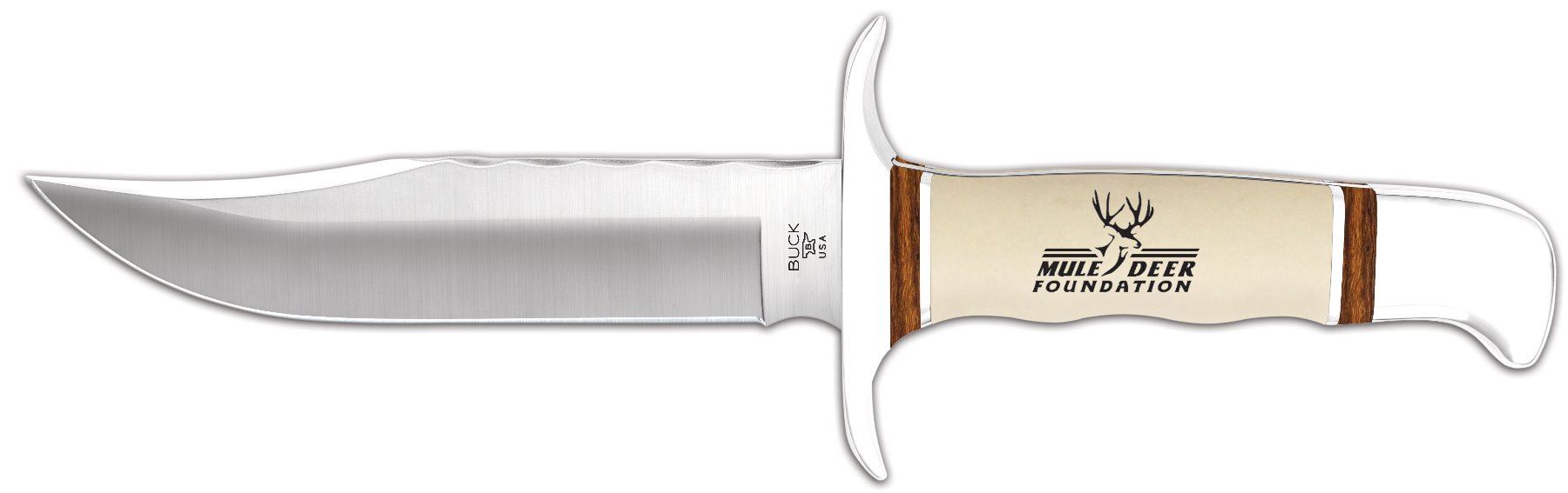 USA made BUCK custom knife – “Model 640 XL". The knife features a blade mirror polished 440 HC, Serialized 1 of 1, signed by CJ Buck. Handle Ivory micarta with iron wood spacers. Nickel silver guard and butt. The knife comes with a glass top display that feature the Mule Deer.
