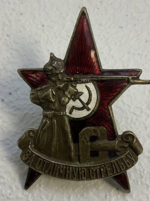 USSR 1928 EXCELLENT MARKSMANSHIP BADGE . NICE EARLY LARGE BADGE WITH GREAT ENAMEL .